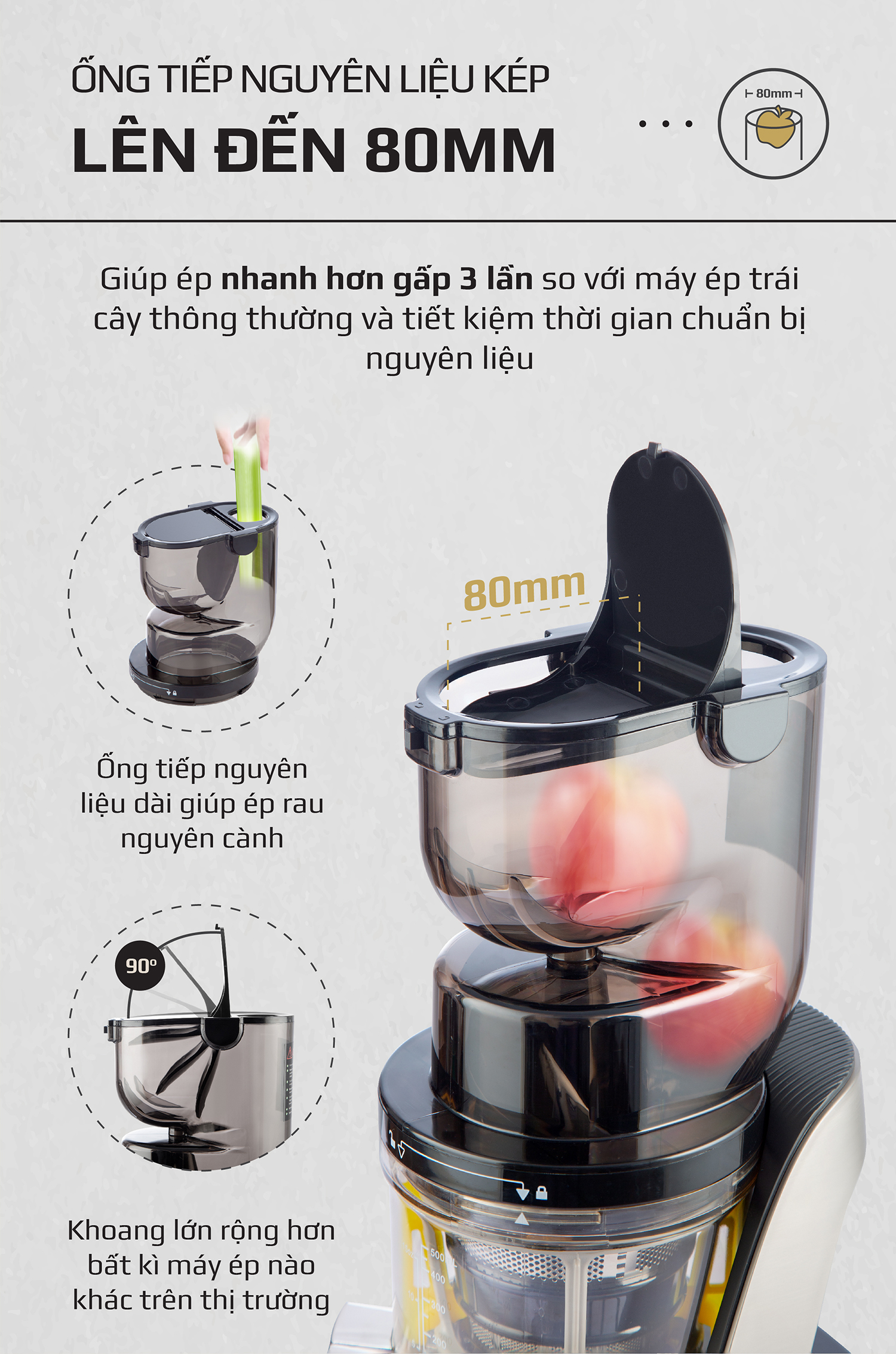 - Khoang lớn có kích thước 8cm x 8cm, rộng hơn bất kì máy ép trái cây nào trên thị trường, đủ lớn để phù hợp với các loại quả như táo, cam, cà chua….