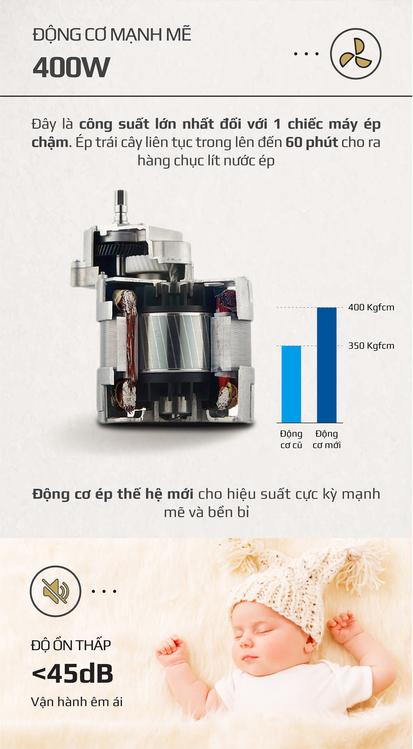 - Máy ép hoa quả chậm OLIVO SJ189 với động cơ ép thế hệ thứ hai có công suất mạnh mẽ lên đến 400W (đây là công suất lớn nhất đối với 1 chiếc máy ép chậm). Động cơ mạnh mẽ này mang đến khả năng ép trái cây liên tục trong lên đến 60 phút cho ra hàng chục lít nước ép mà vẫn cực kỳ yên tĩnh trong lúc vận hành – mang lại cảm giác dễ chịu khi sử dụng.