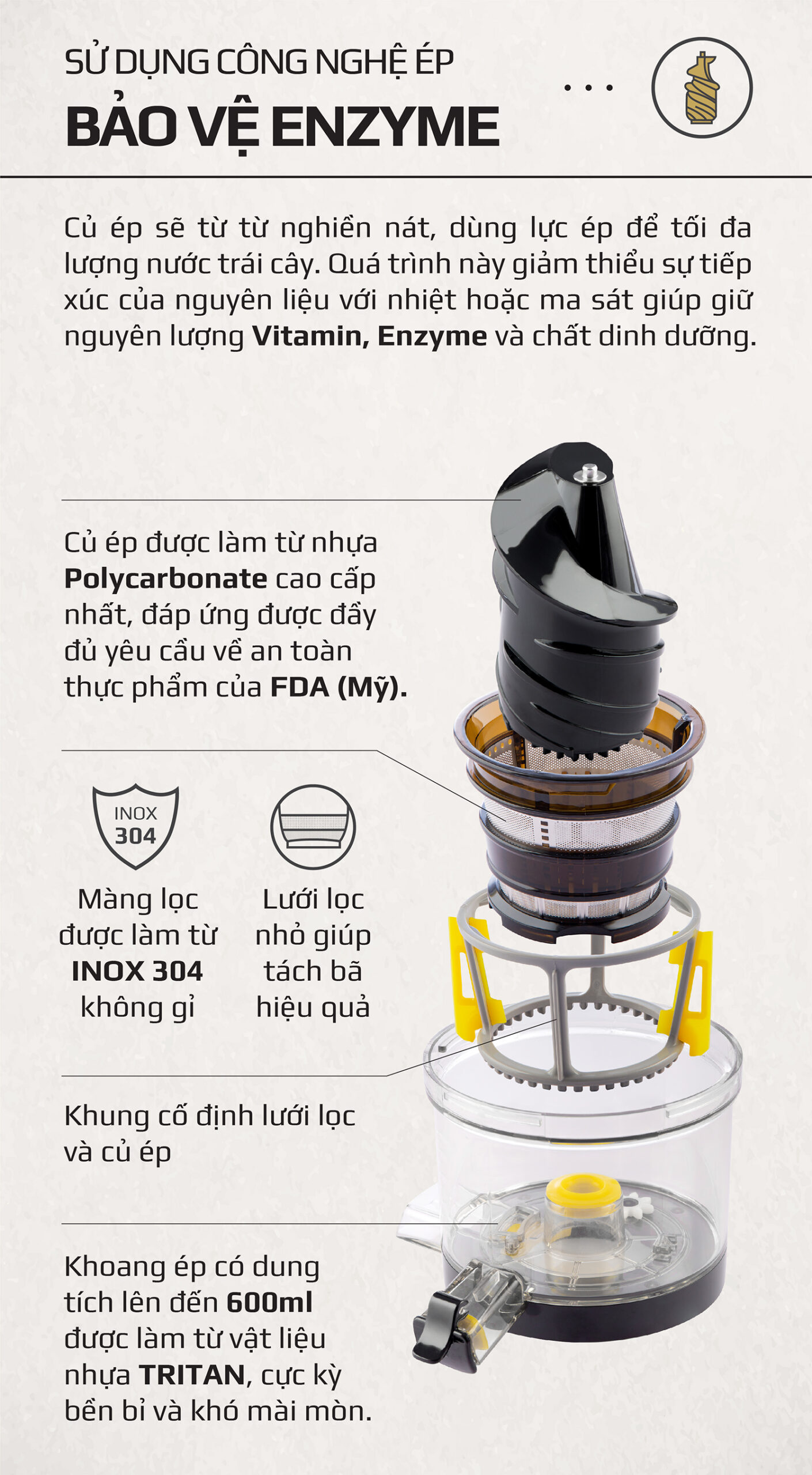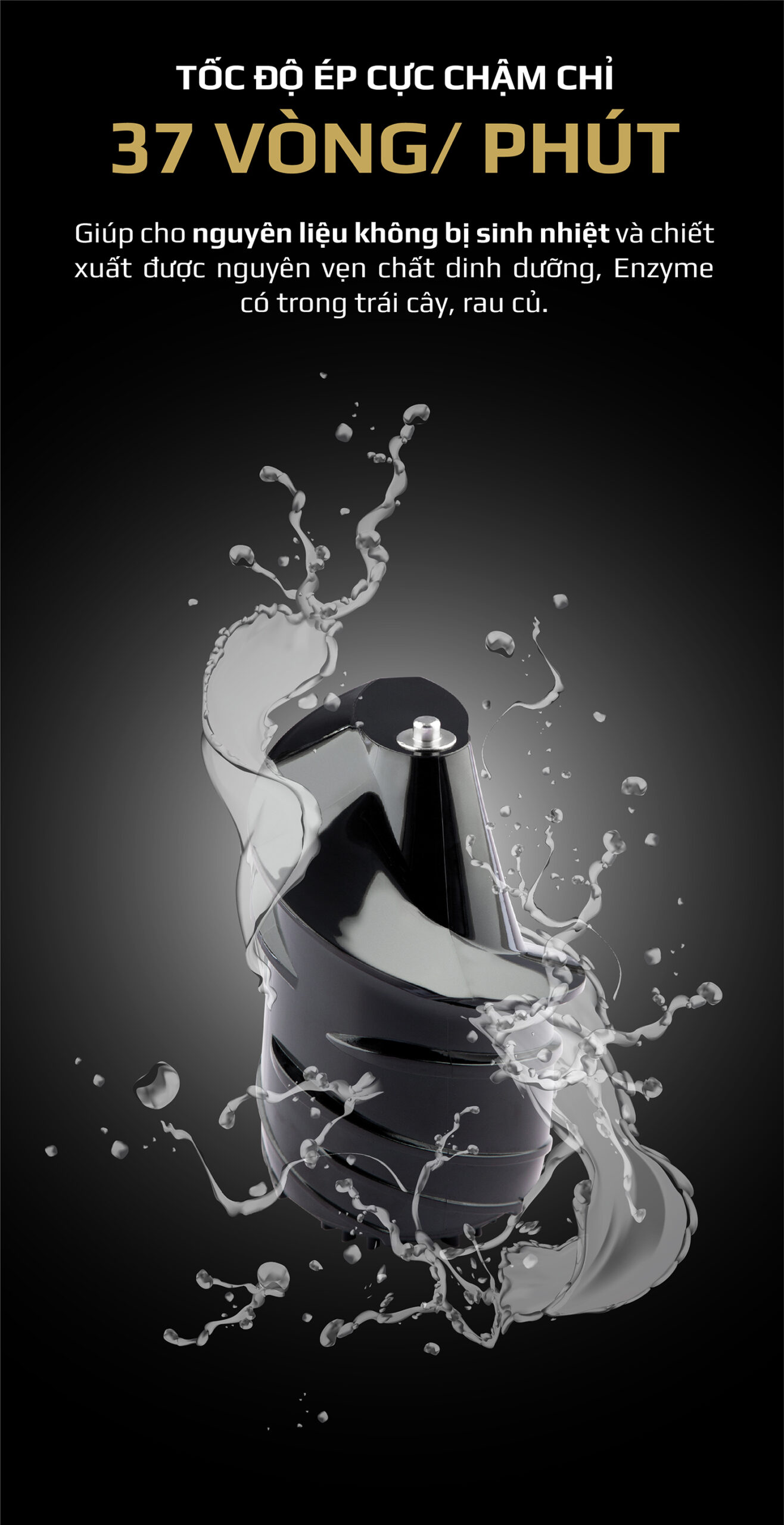- Tốc độ ép chậm 37 vòng/phút làm cho nguyên liệu không bị sinh nhiệt giúp chiết xuất được nguyên vẹn chất dinh dưỡng và Enzyme có trong trái cây, rau củ.