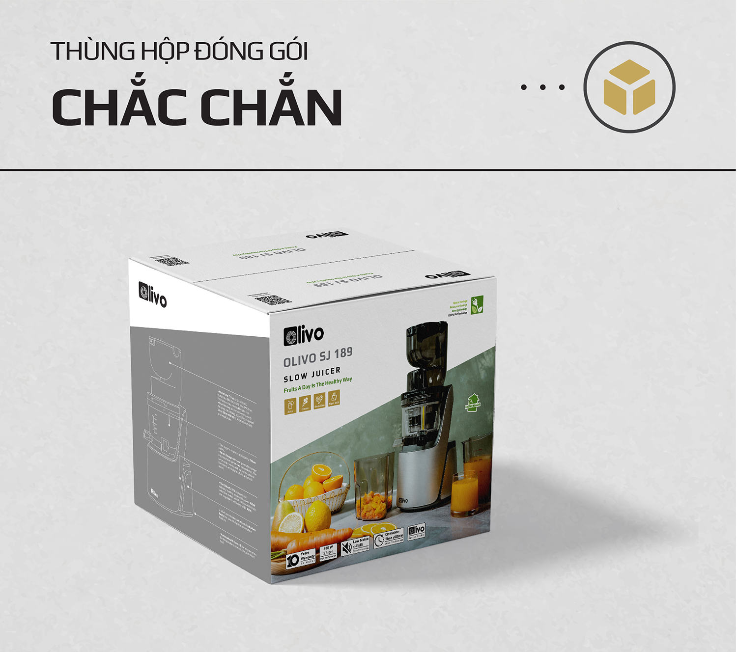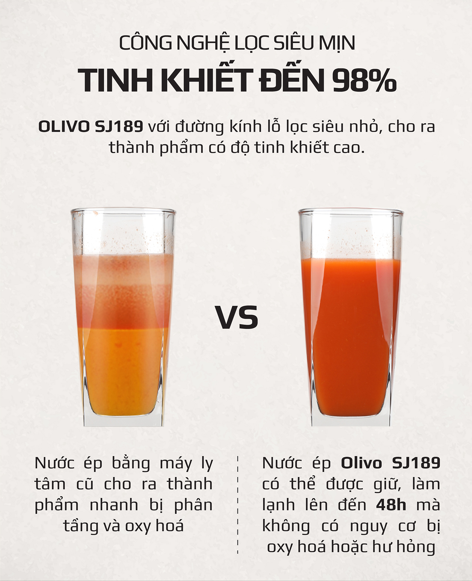 - Nước ép từ máy ép OLIVO SJ189 có thể được giữ, làm lạnh trong tối đa 48 giờ mà không có nguy cơ bị oxy hóa hoặc hư hỏng. Đây là một công nghệ vượt bậc so với các dòng máy ép trái cây ly tâm.