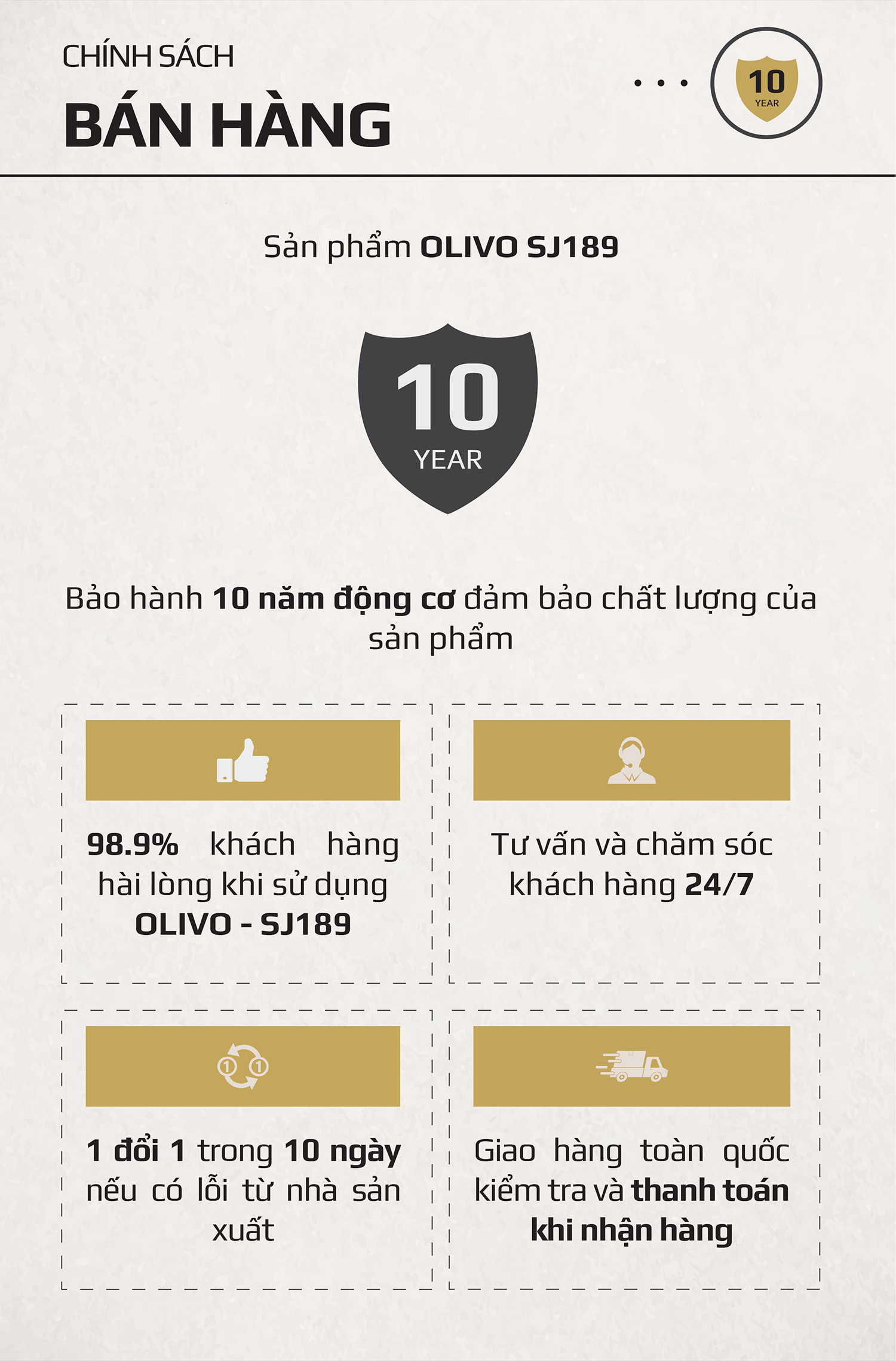 - OLIVO SJ189 khẳng định chất lượng và sự bền bỉ theo thời gian với gói bảo hành 10 năm đối với động cơ giúp bạn an tâm trong suốt quá trình sử dụng.