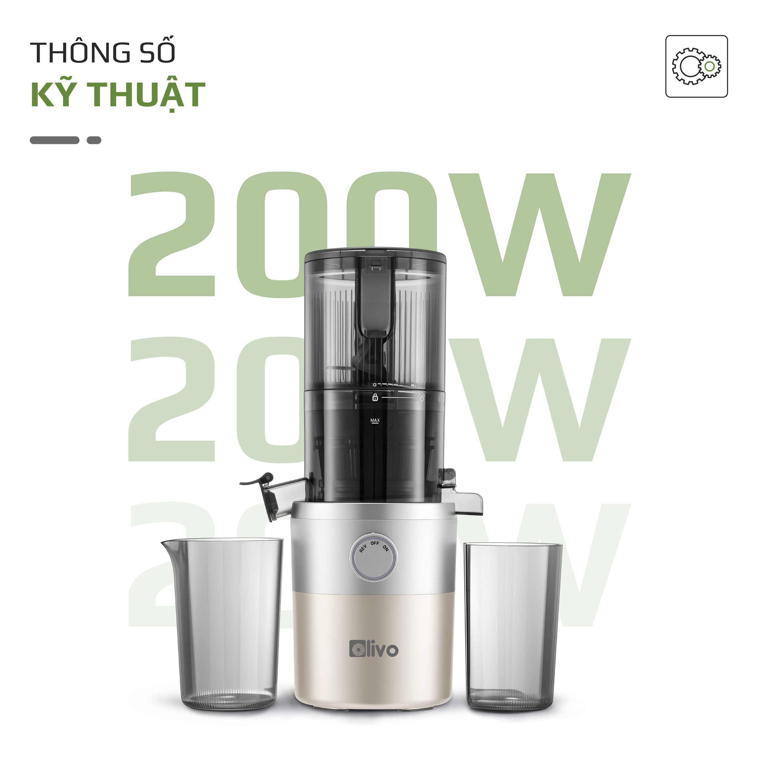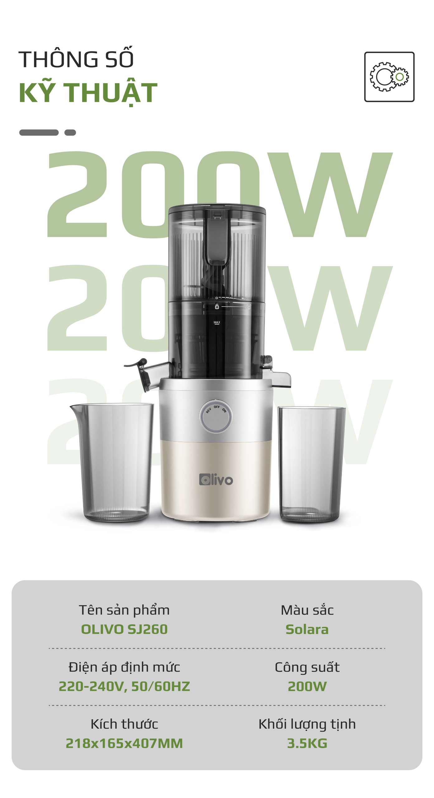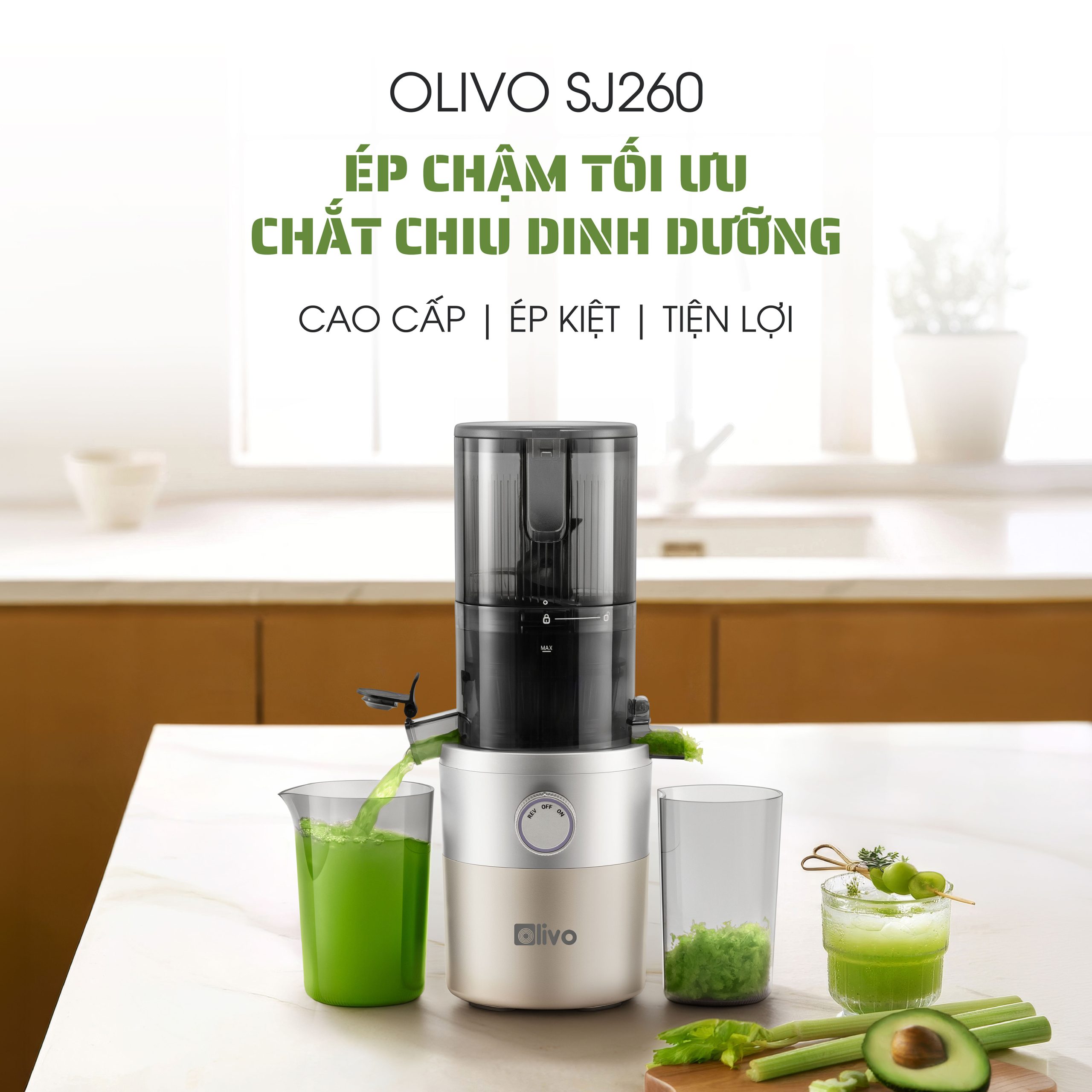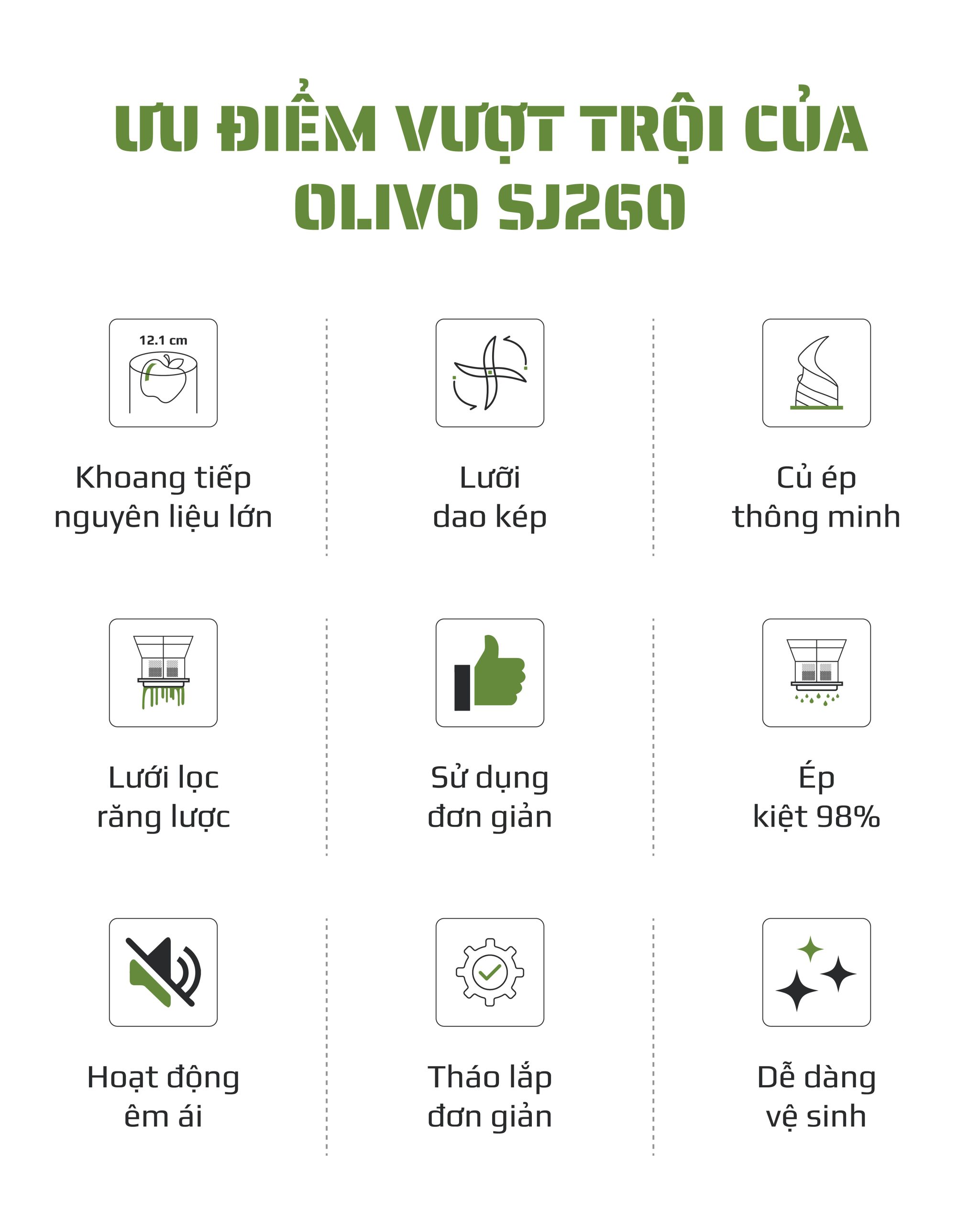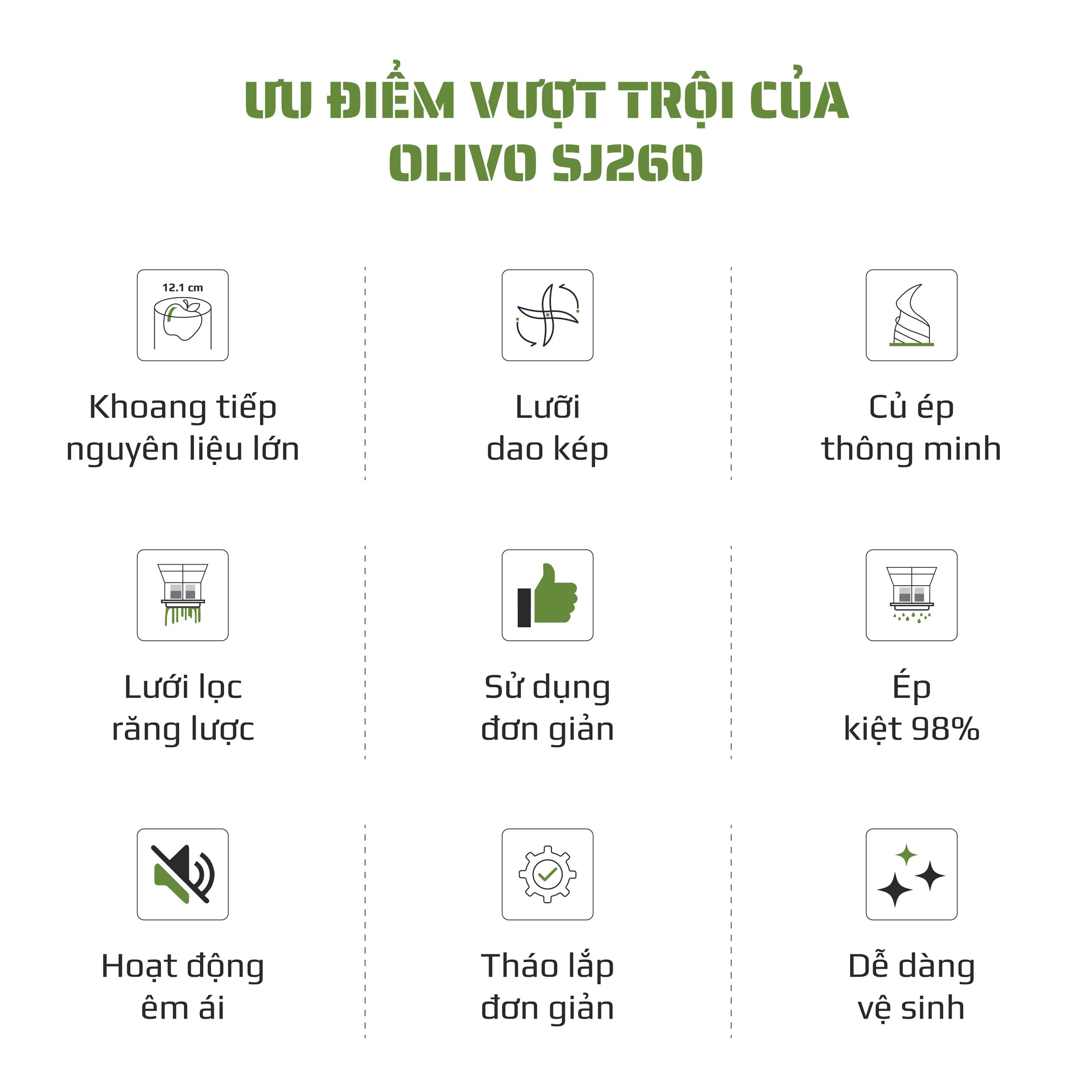 - Máy ép chậm OLIVO SJ260 có khả năng ép kiệt lên đến 98%, giúp thu được lượng nước ép tối đa từ nguyên liệu. Điều này không chỉ tiết kiệm chi phí mà còn đảm bảo tận dụng trọn vẹn dinh dưỡng.