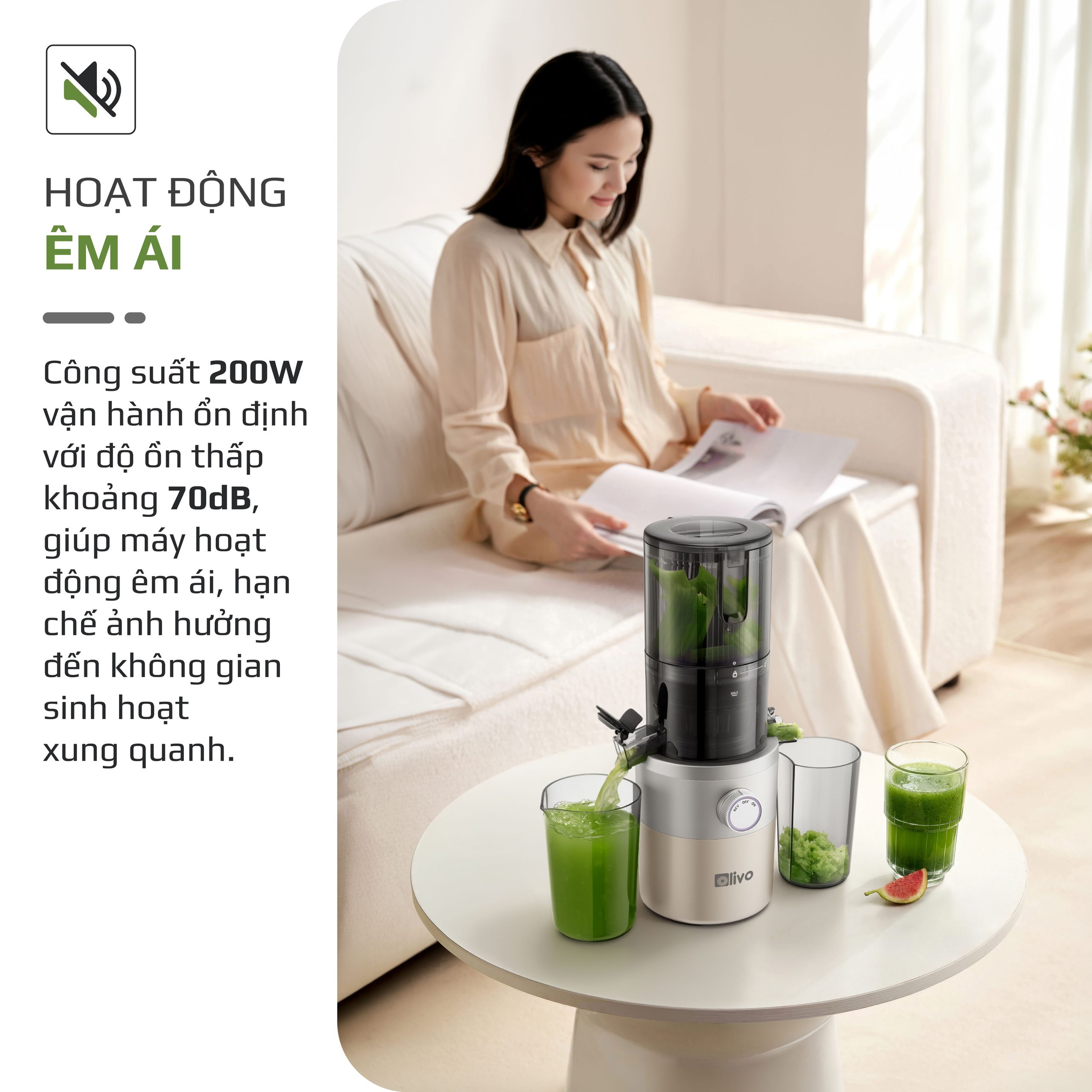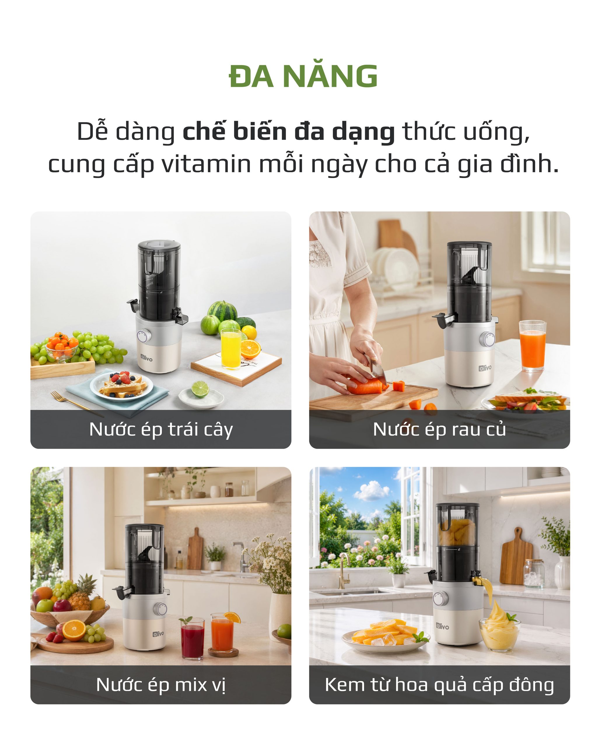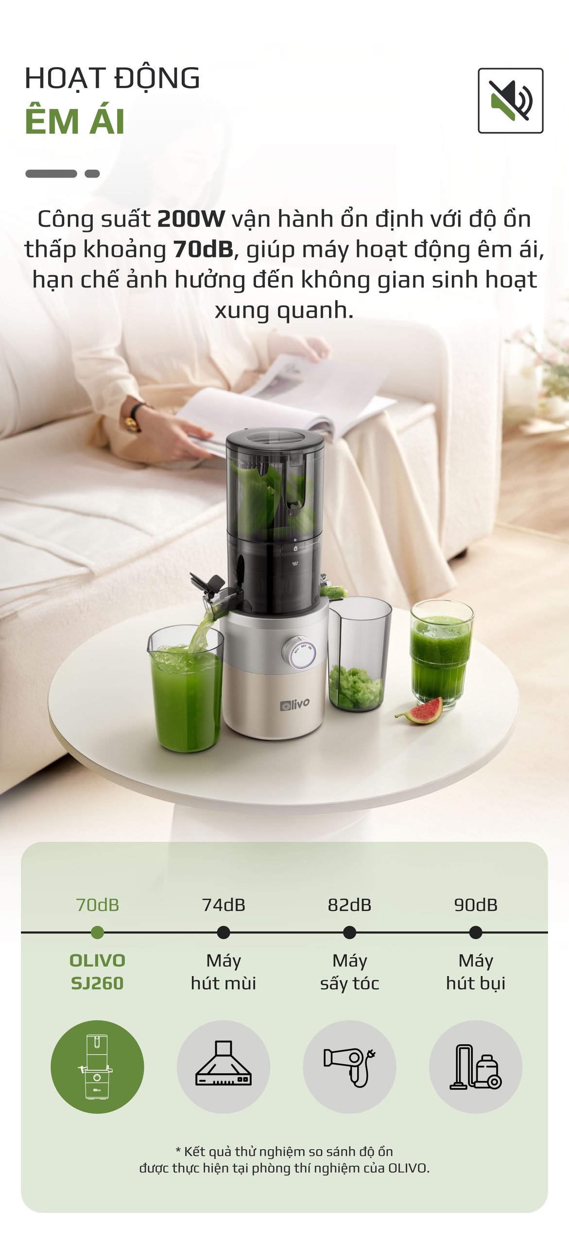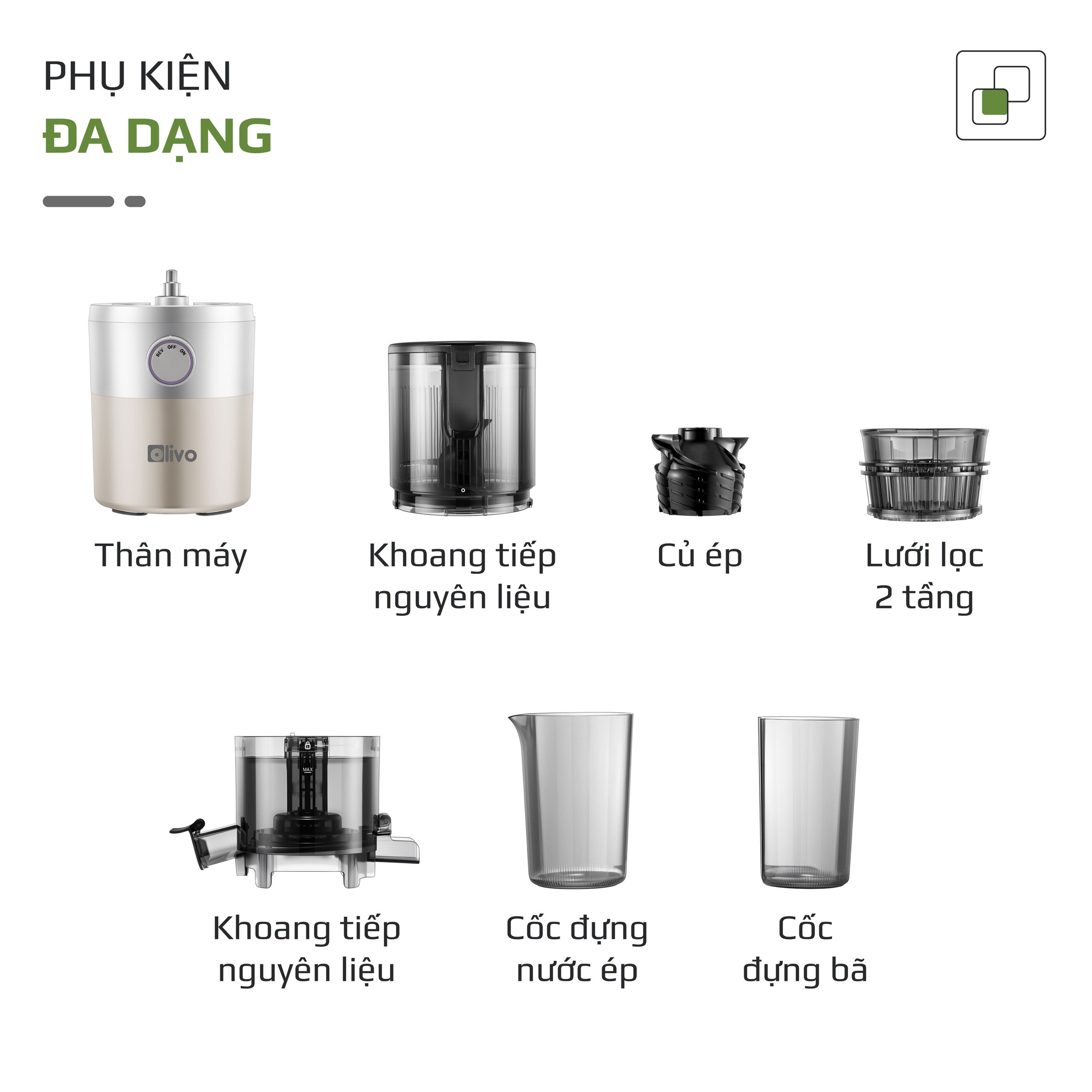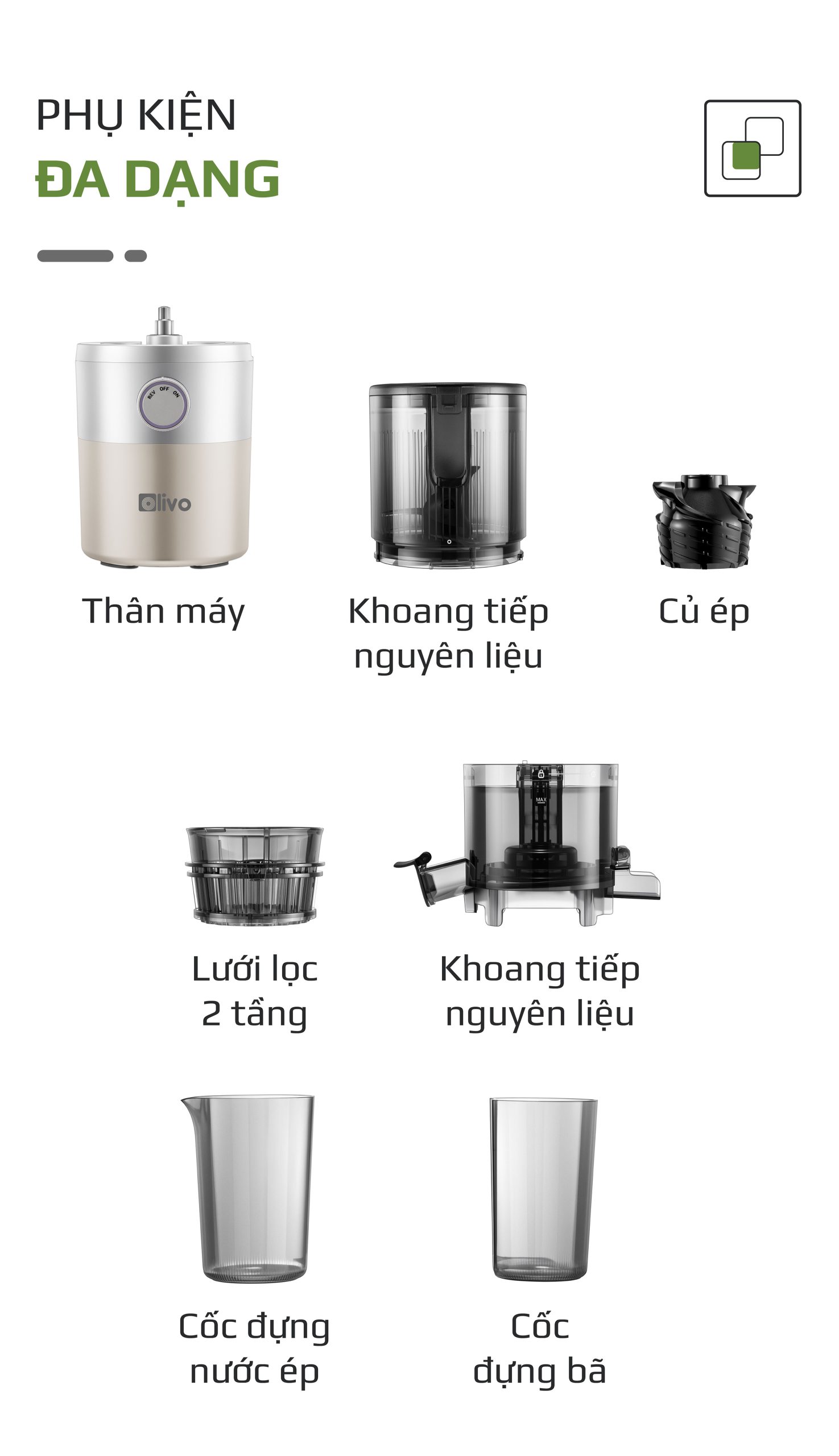 - Máy ép chậm OLIVO SJ260 có khả năng ép kiệt lên đến 98%, giúp thu được lượng nước ép tối đa từ nguyên liệu. Điều này không chỉ tiết kiệm chi phí mà còn đảm bảo tận dụng trọn vẹn dinh dưỡng.