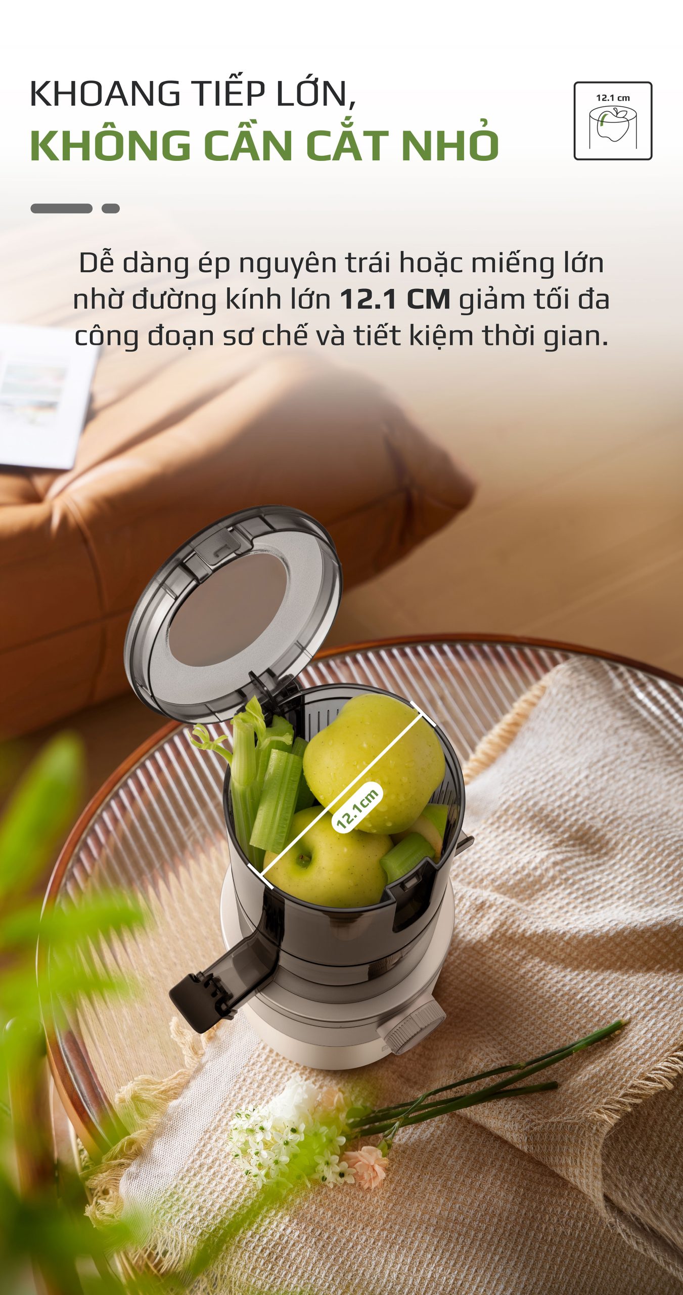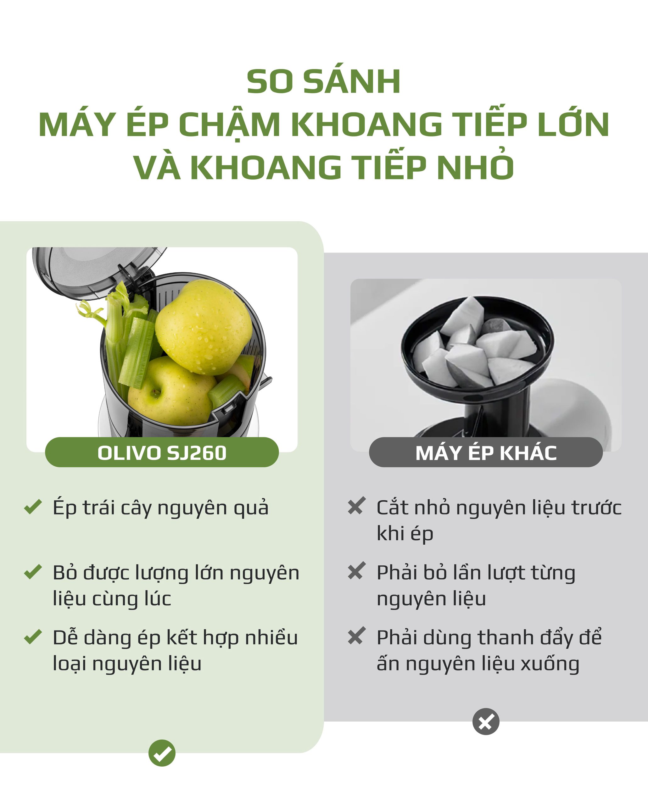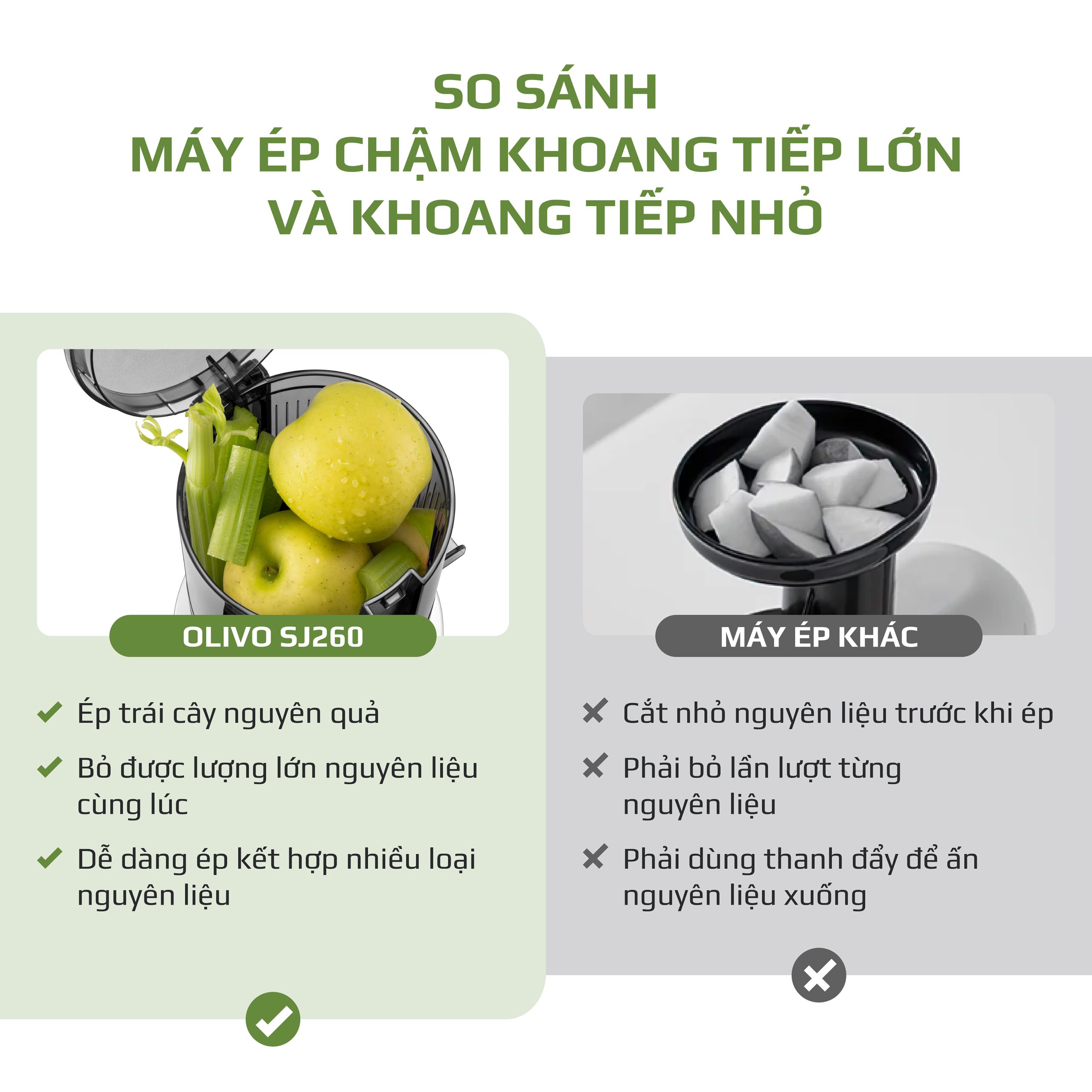- OLIVO SJ260 được thiết kế với khoang tiếp nguyên liệu đường kính 12.1cm, cho phép ép trái cây và rau củ nguyên miếng mà không cần cắt nhỏ. Điều này giúp tiết kiệm đáng kể thời gian sơ chế, đặc biệt phù hợp với những người bận rộn. Không chỉ tiện lợi, thiết kế này còn giúp giảm thiểu quá trình oxy hóa nguyên liệu, giữ trọn dưỡng chất và hương vị tự nhiên trong từng ly nước ép.