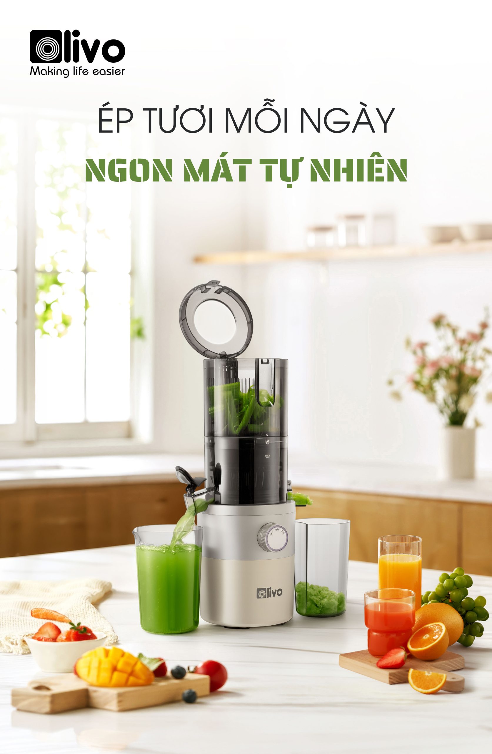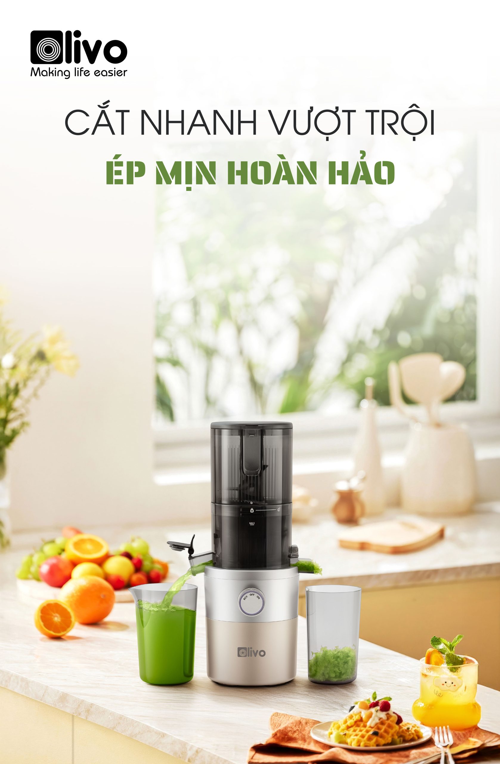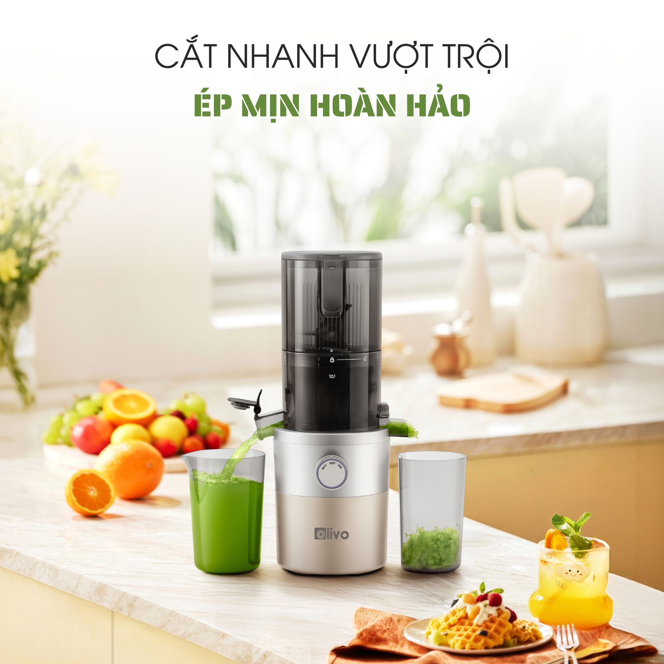 - OLIVO SJ260 được thiết kế với khoang tiếp nguyên liệu đường kính 12.1cm, cho phép ép trái cây và rau củ nguyên miếng mà không cần cắt nhỏ. Điều này giúp tiết kiệm đáng kể thời gian sơ chế, đặc biệt phù hợp với những người bận rộn. Không chỉ tiện lợi, thiết kế này còn giúp giảm thiểu quá trình oxy hóa nguyên liệu, giữ trọn dưỡng chất và hương vị tự nhiên trong từng ly nước ép.