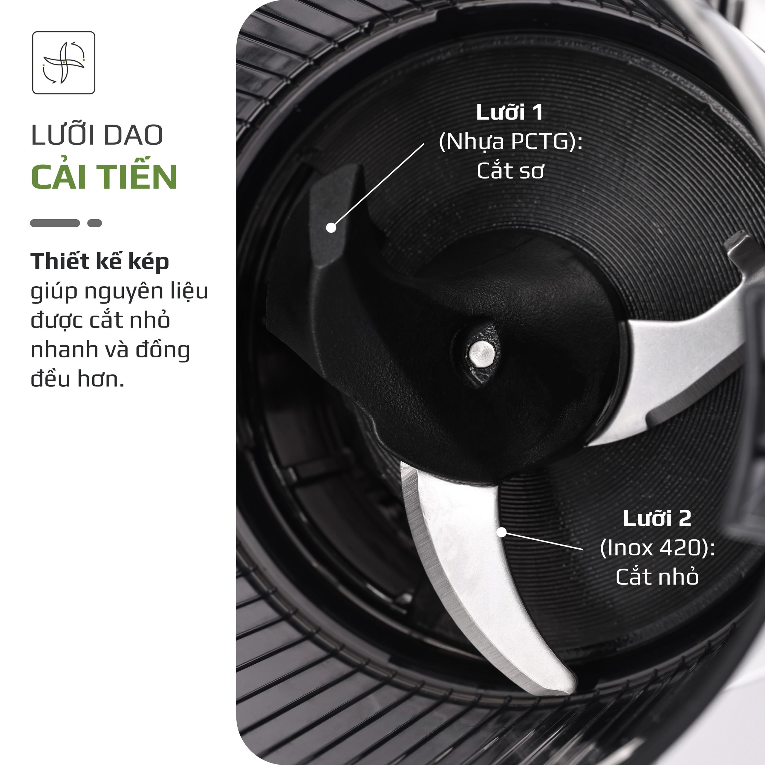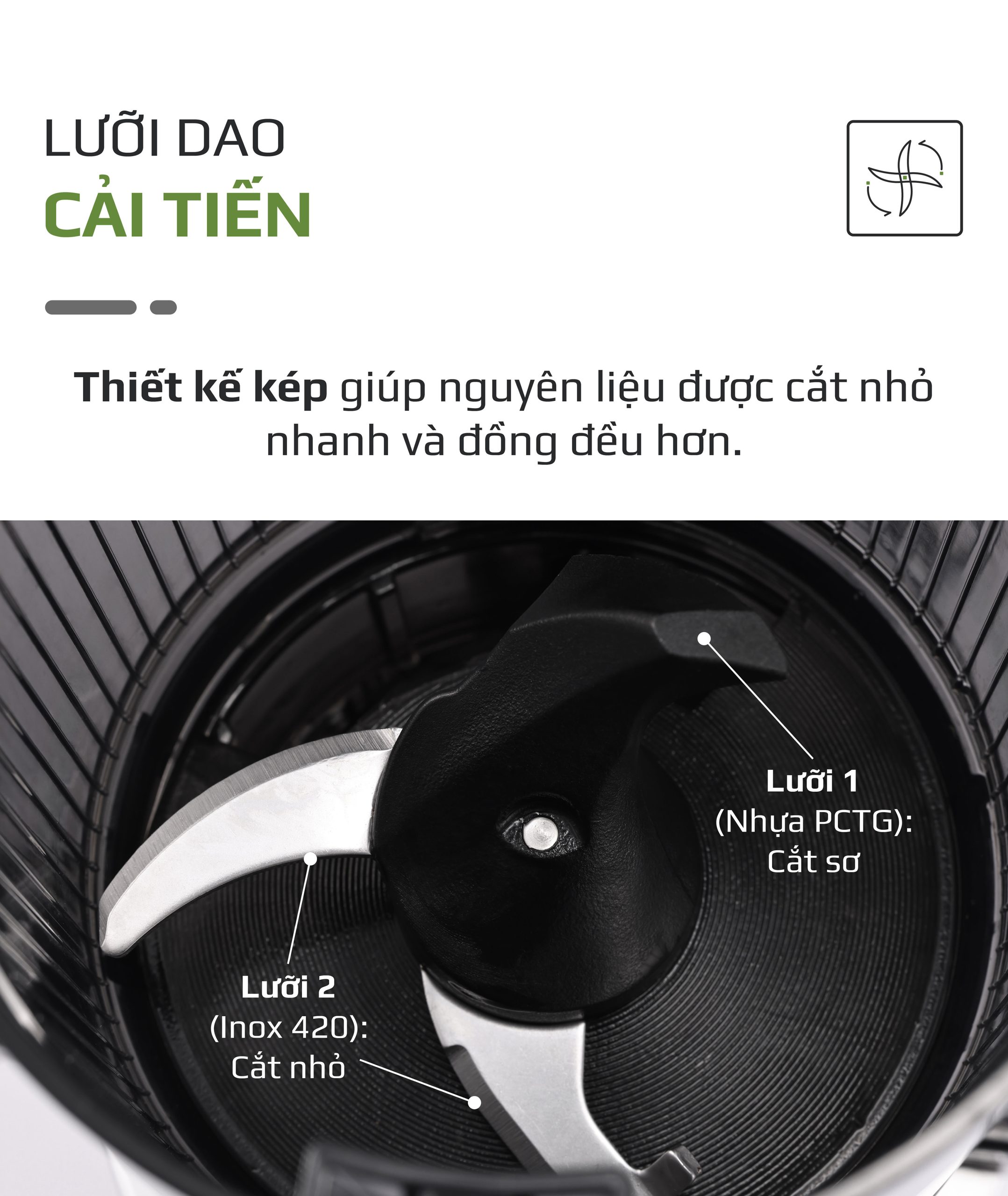 - Máy được trang bị lưỡi dao kép sắc bén, hỗ trợ cắt và nghiền nguyên liệu nhanh chóng và hiệu quả. Nhờ đó, quá trình ép diễn ra mượt mà, giảm tình trạng kẹt máy khi ép các loại rau củ cứng.