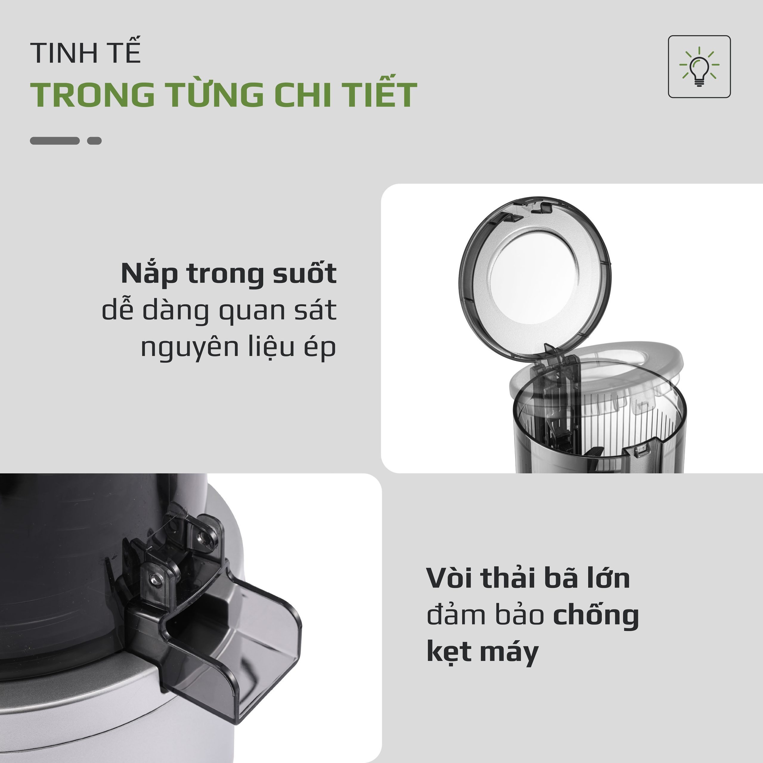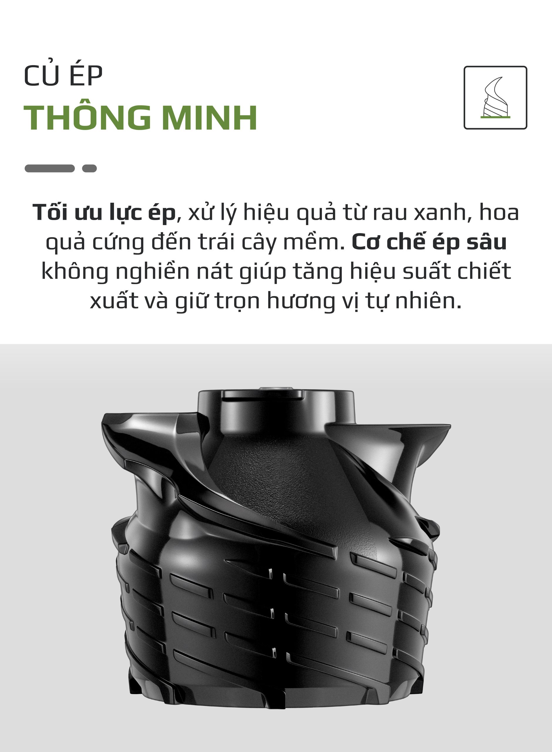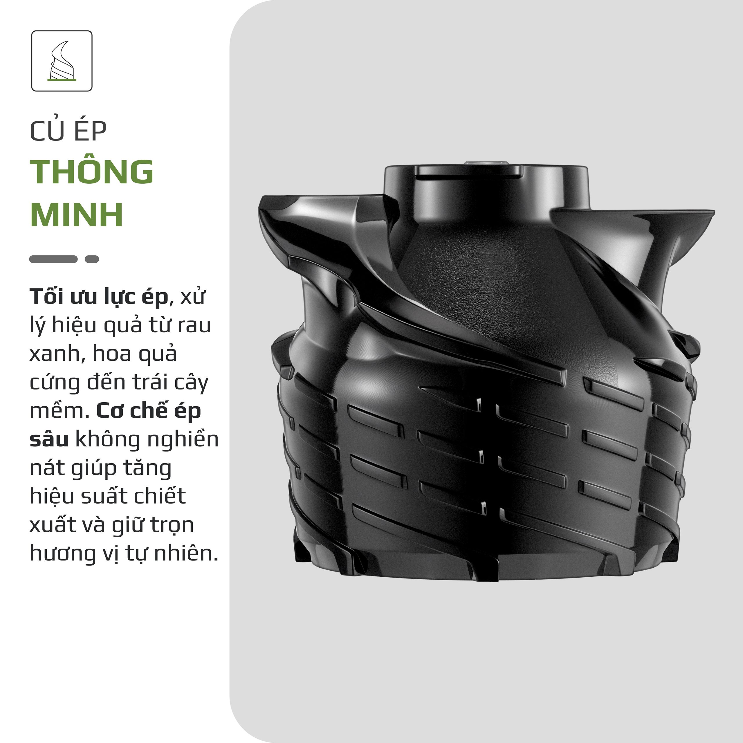 - Củ ép được thiết kế tối ưu giúp ép nguyên liệu đều và hiệu quả hơn, hạn chế tối đa lượng bã còn sót lại cho thành quả nước ép sánh mịn, không phân tầng, tách nước. Điều này giúp bạn tận dụng tối đa dưỡng chất từ trái cây và rau củ. Đồng thời, thiết kế thông minh còn hỗ trợ giảm lực tác động lên động cơ, giúp máy vận hành bền bỉ và tiết kiệm điện năng hơn.