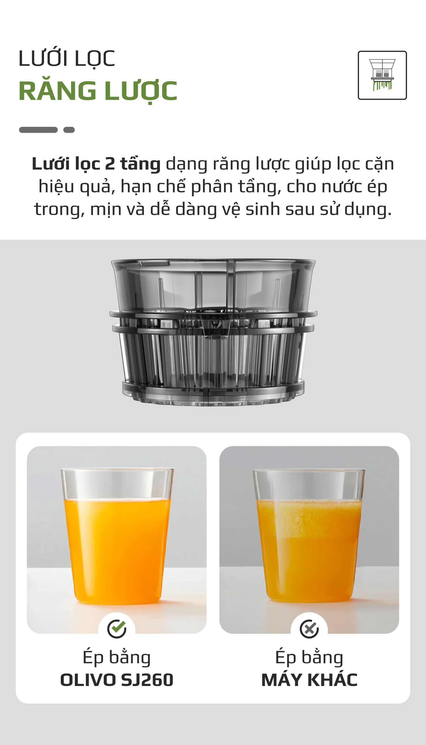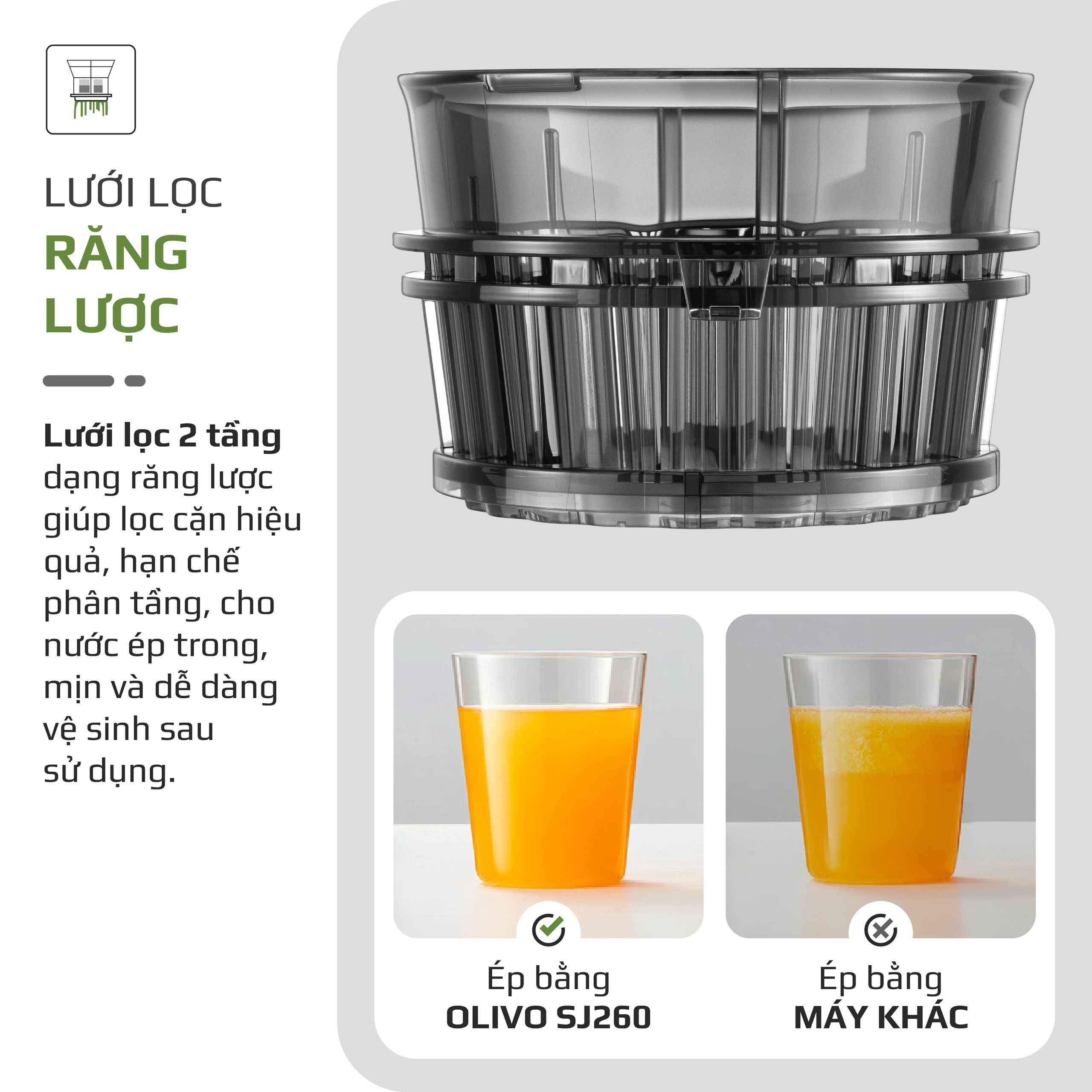 - Lưới lọc răng lược giúp phân tách nước ép và bã một cách hiệu quả, mang lại ly nước ép sánh mịn, ít bã và giữ nguyên hương vị tự nhiên.