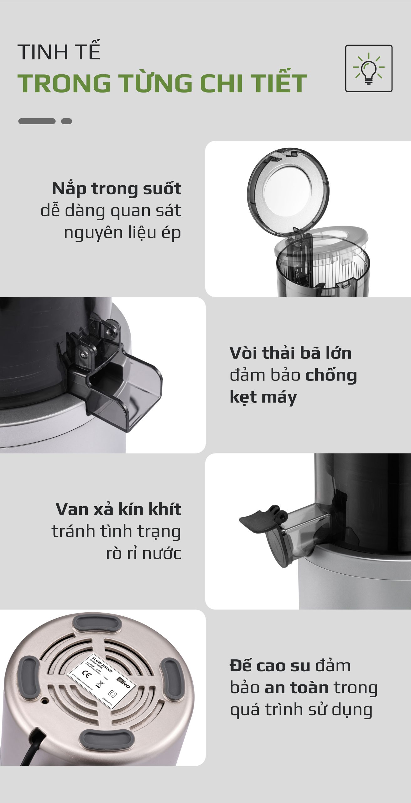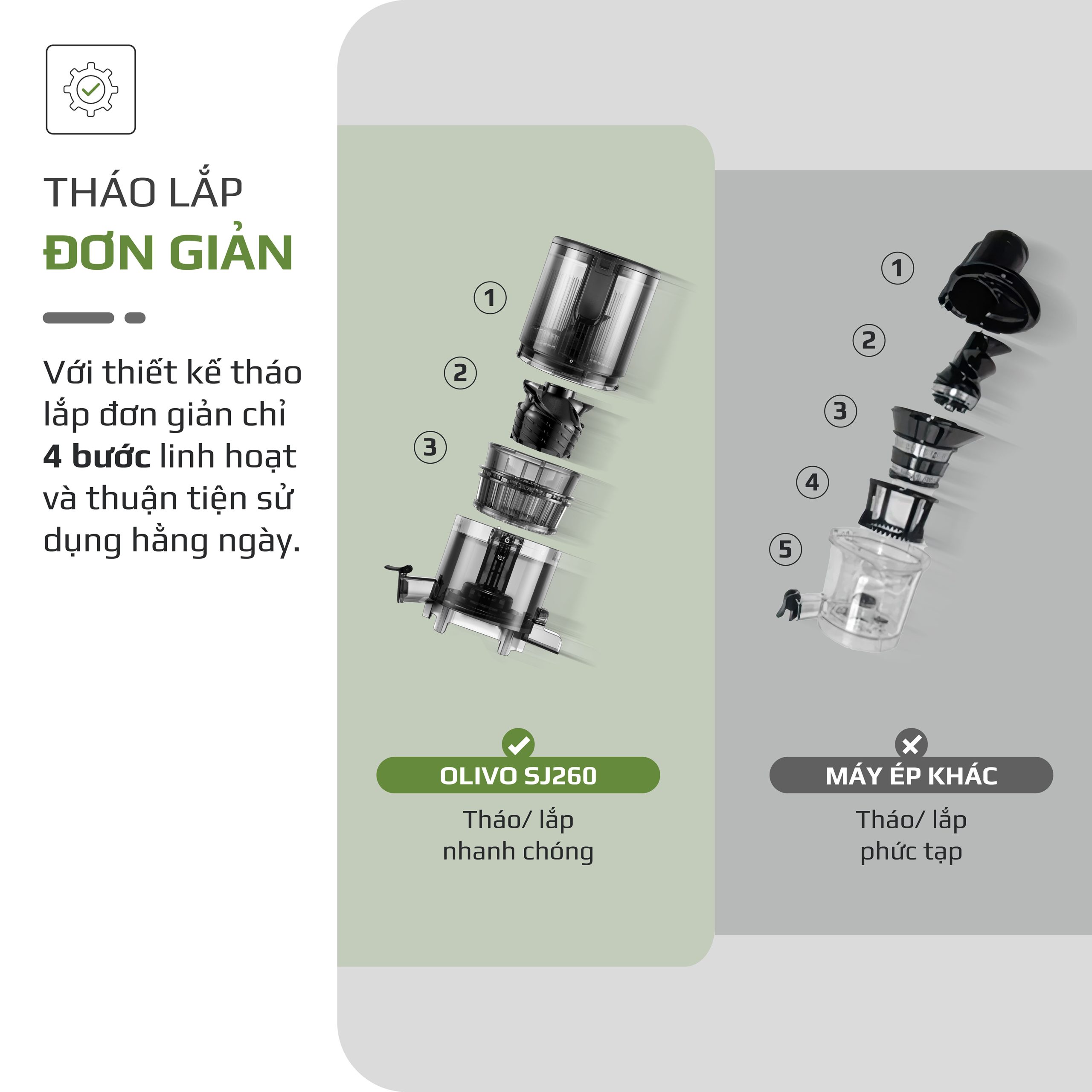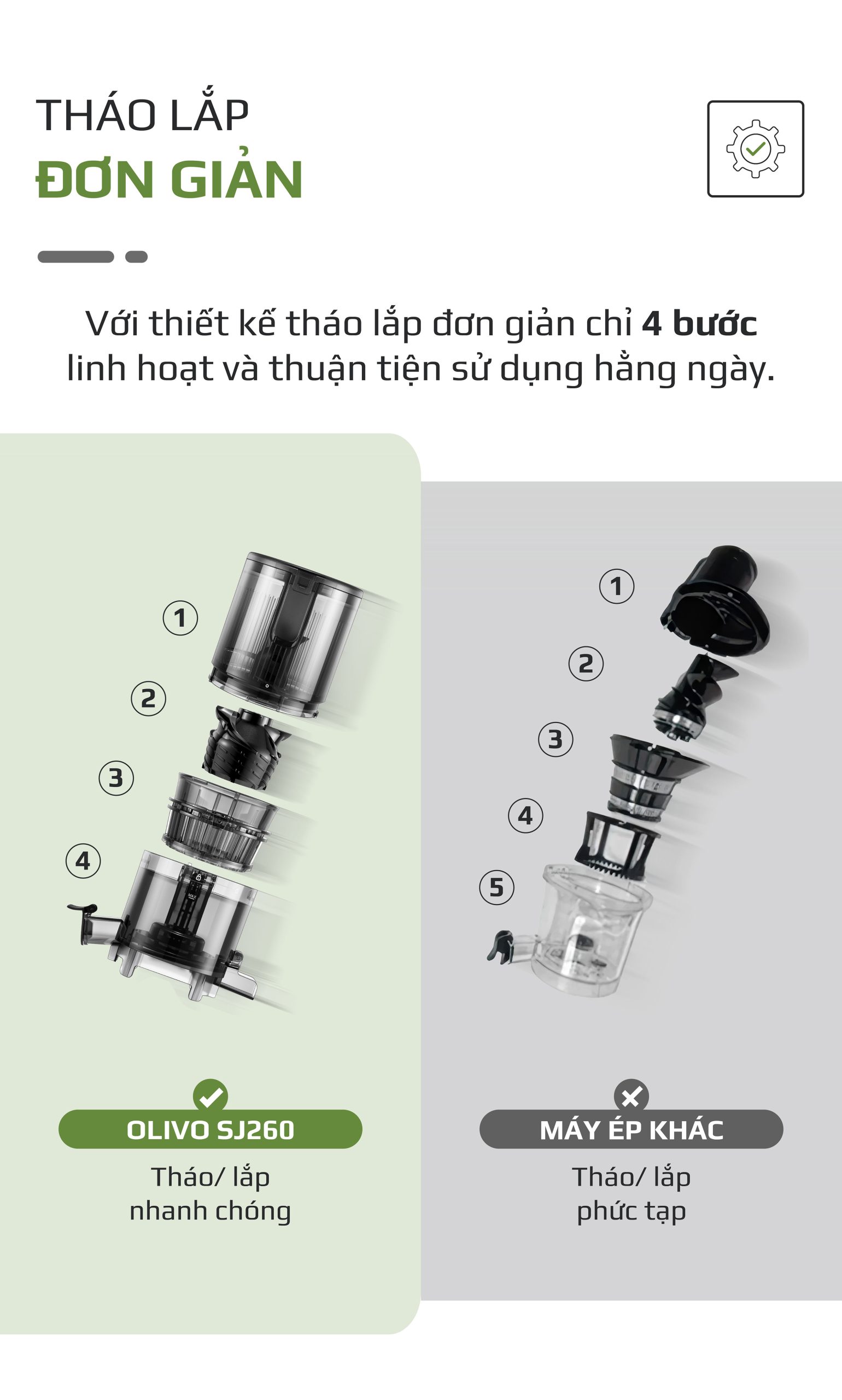 - Sau khi sử dụng, việc vệ sinh máy là bước khiến nhiều người cảm thấy e ngại. Với máy ép chậm Olivo SJ260, vệ sinh máy trở nên nhanh chóng và nhẹ nhàng nhờ thiết kế tối ưu. Các bộ phận có thể rửa sạch dễ dàng dưới vòi nước.