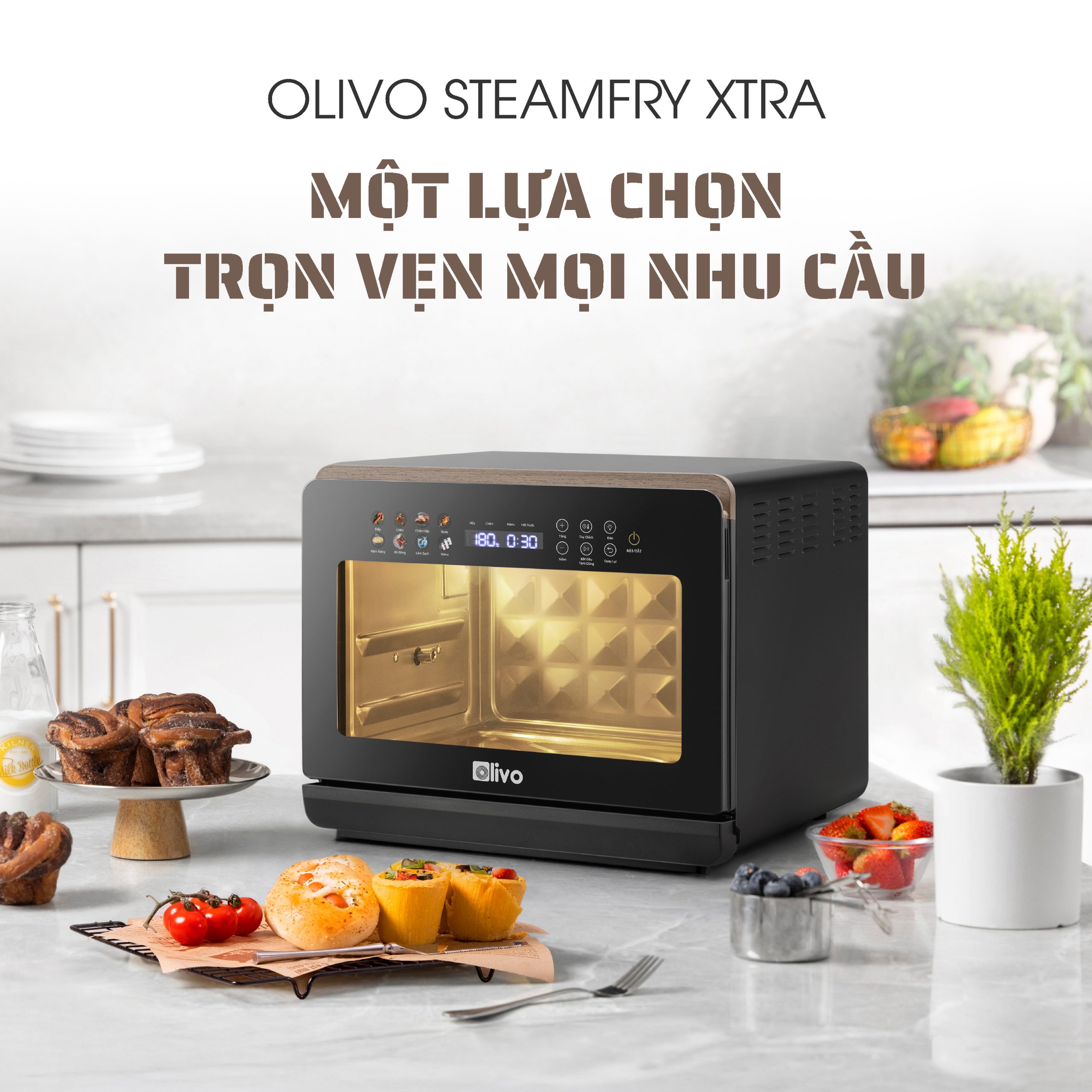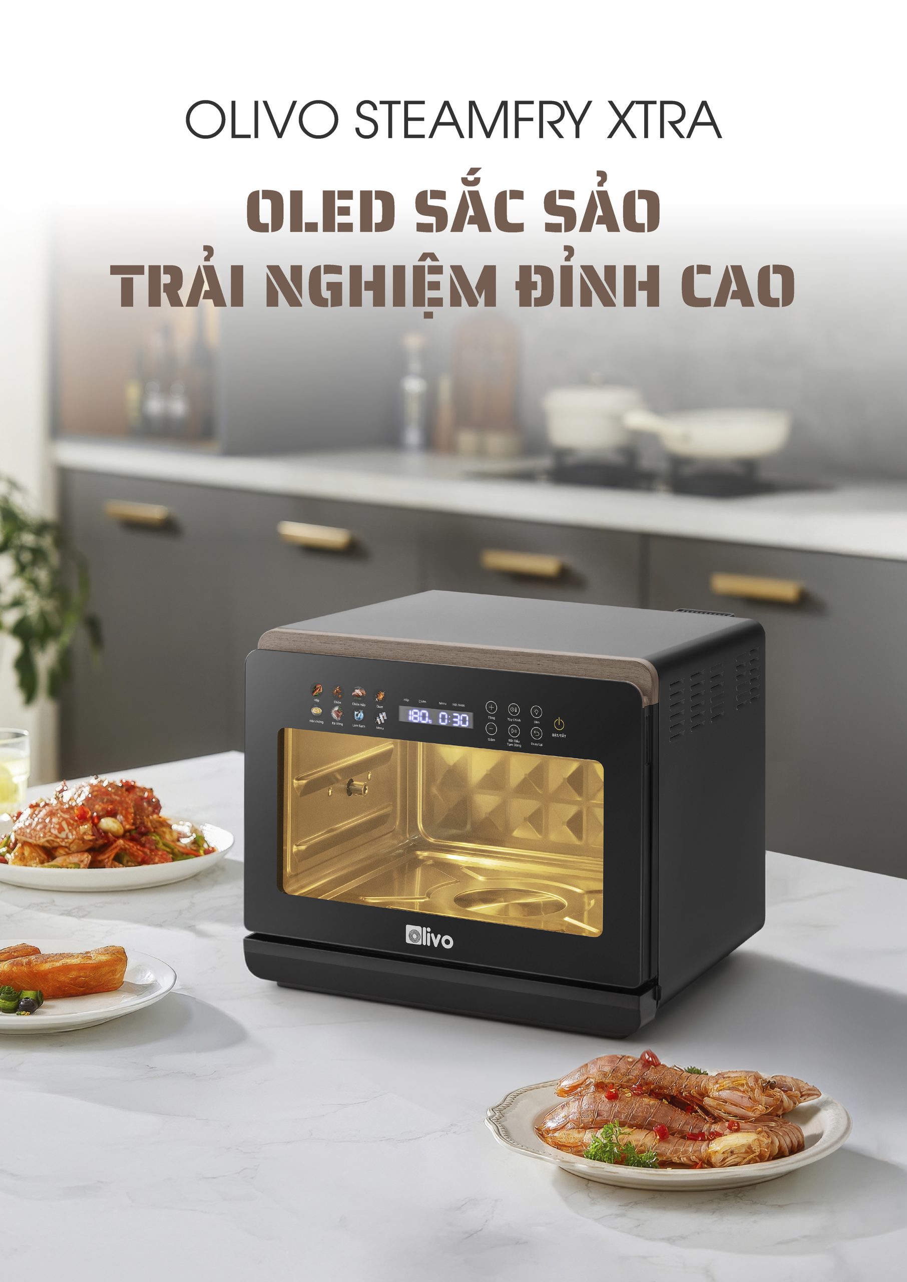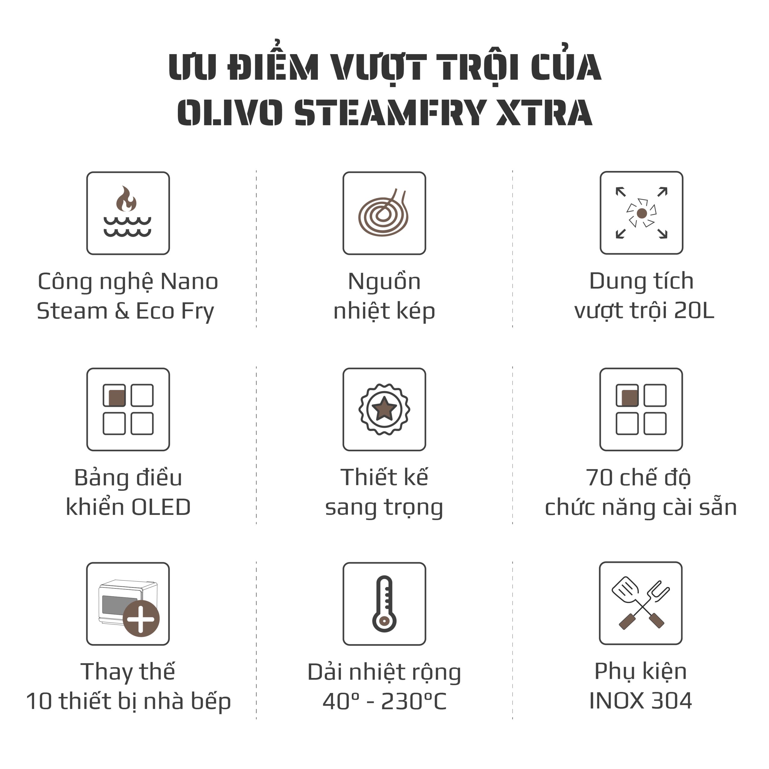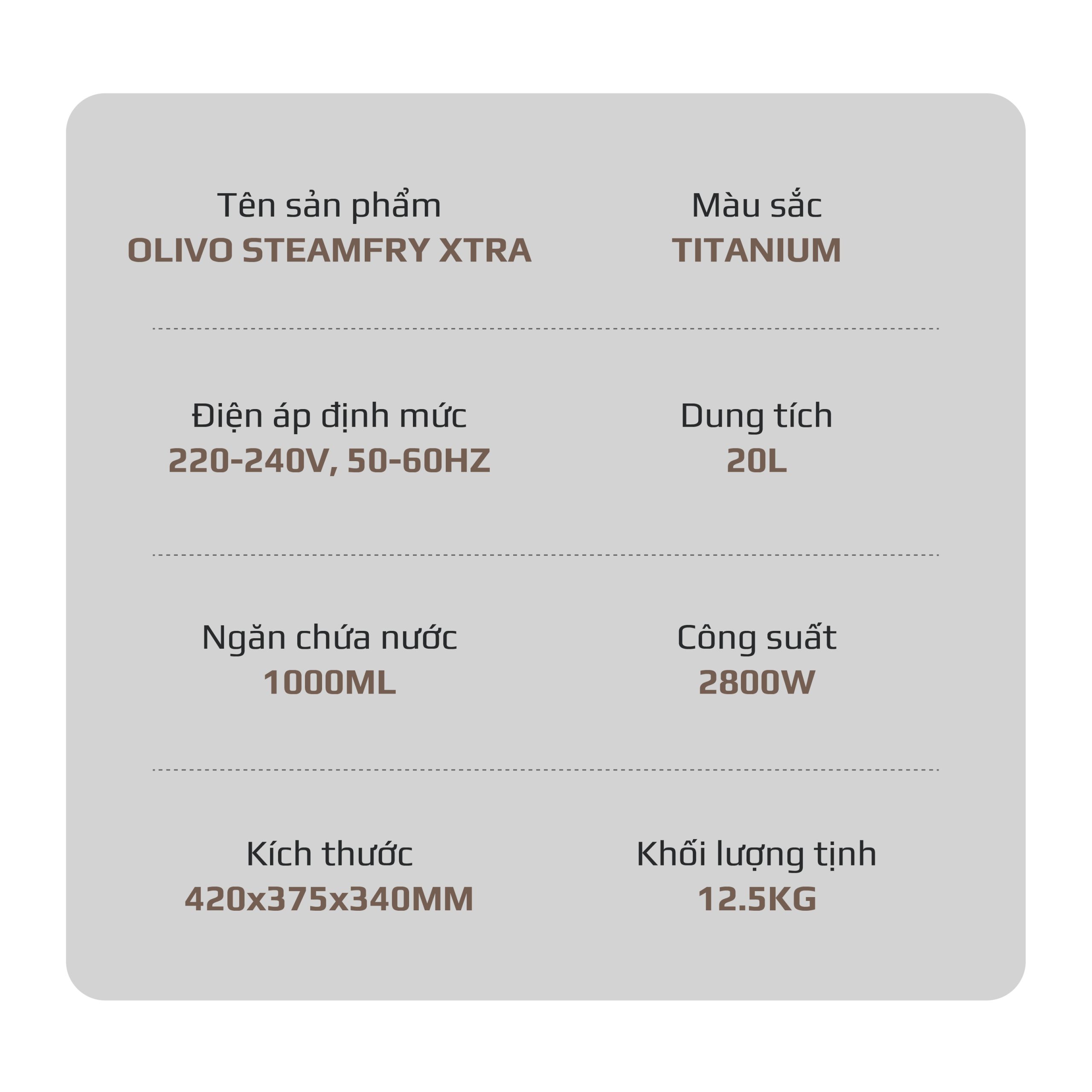 - Nồi chiên hấp đa năng OLIVO SteamFry Xtra mở ra chuẩn mực mới cho căn bếp hiện đại với khả năng kết hợp chiên không dầu và hấp siêu nhiệt trong cùng một thiết bị thông minh. Thuộc phân khúc nồi chiên cỡ lớn, OLIVO SteamFry Xtra sở hữu dung tích 20L, 70 chế độ nấu cài sẵn và hiệu năng mạnh mẽ tương tự dòng OLIVO SF20 Pro nhưng được nâng tầm vượt trội nhờ bảng điều khiển OLED sống động và diện mạo màu Titanium phối vân gỗ đầy tinh tế. Một thiết kế vừa sang trọng, vừa đẳng cấp, đồng thời mang đến trải nghiệm nấu nướng đa nhiệm, chuẩn vị và tiện lợi cho mọi gia đình.