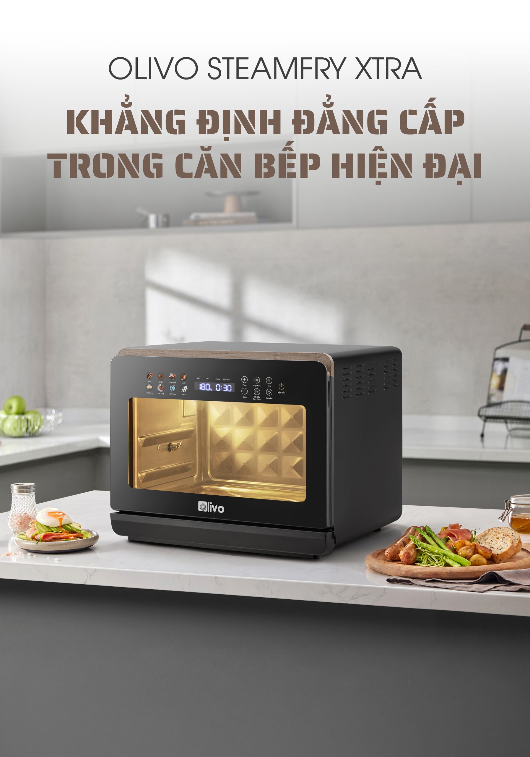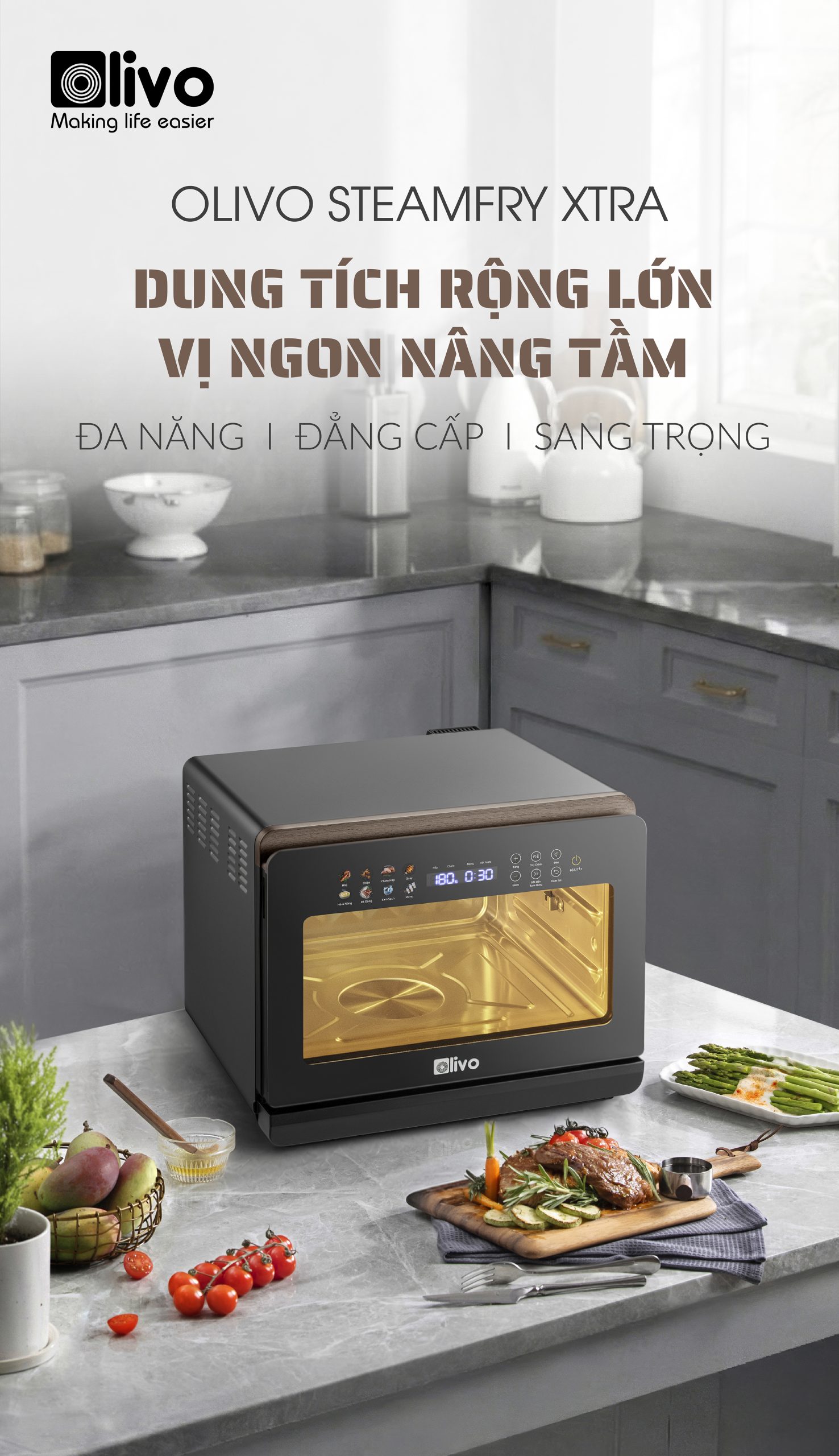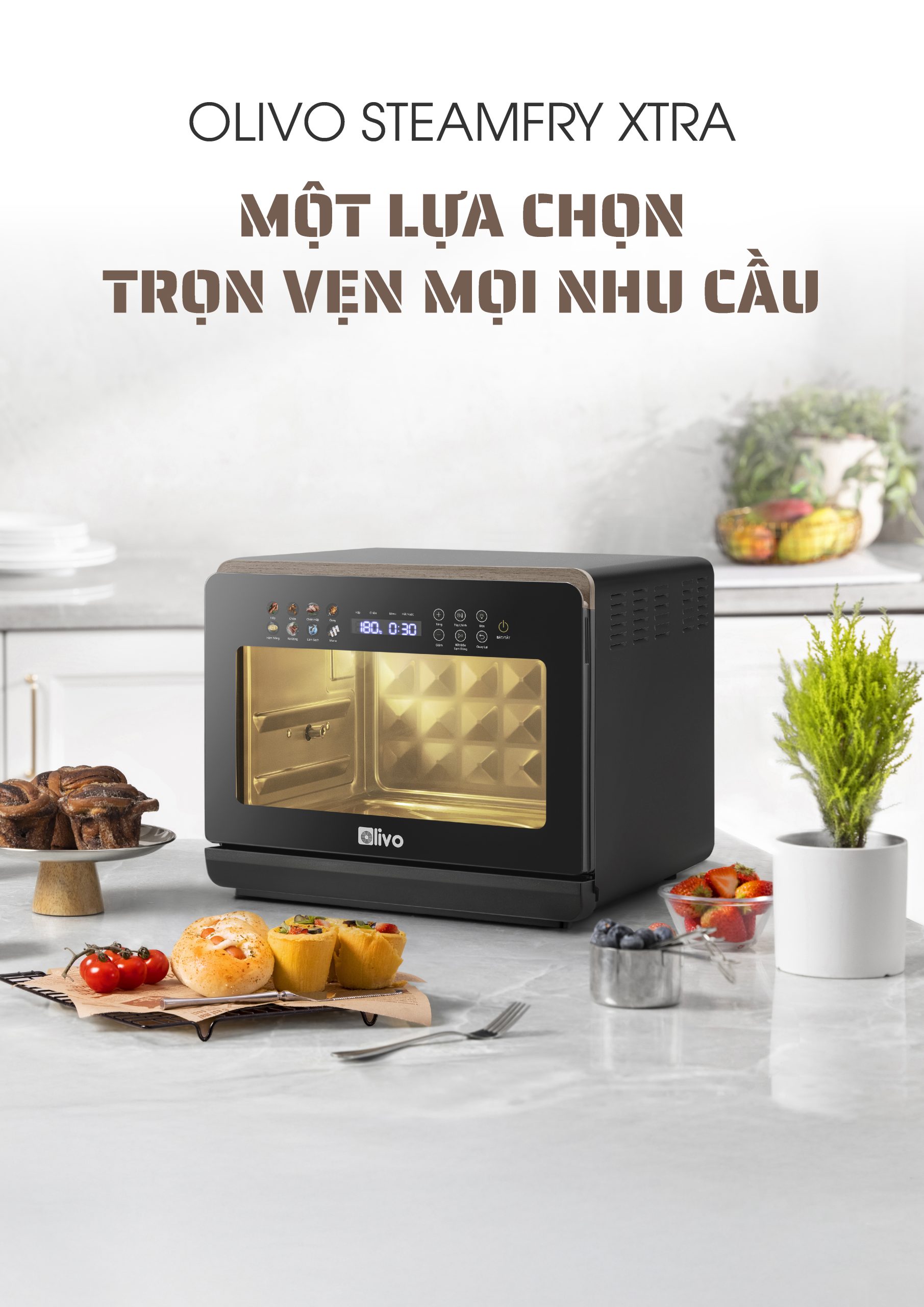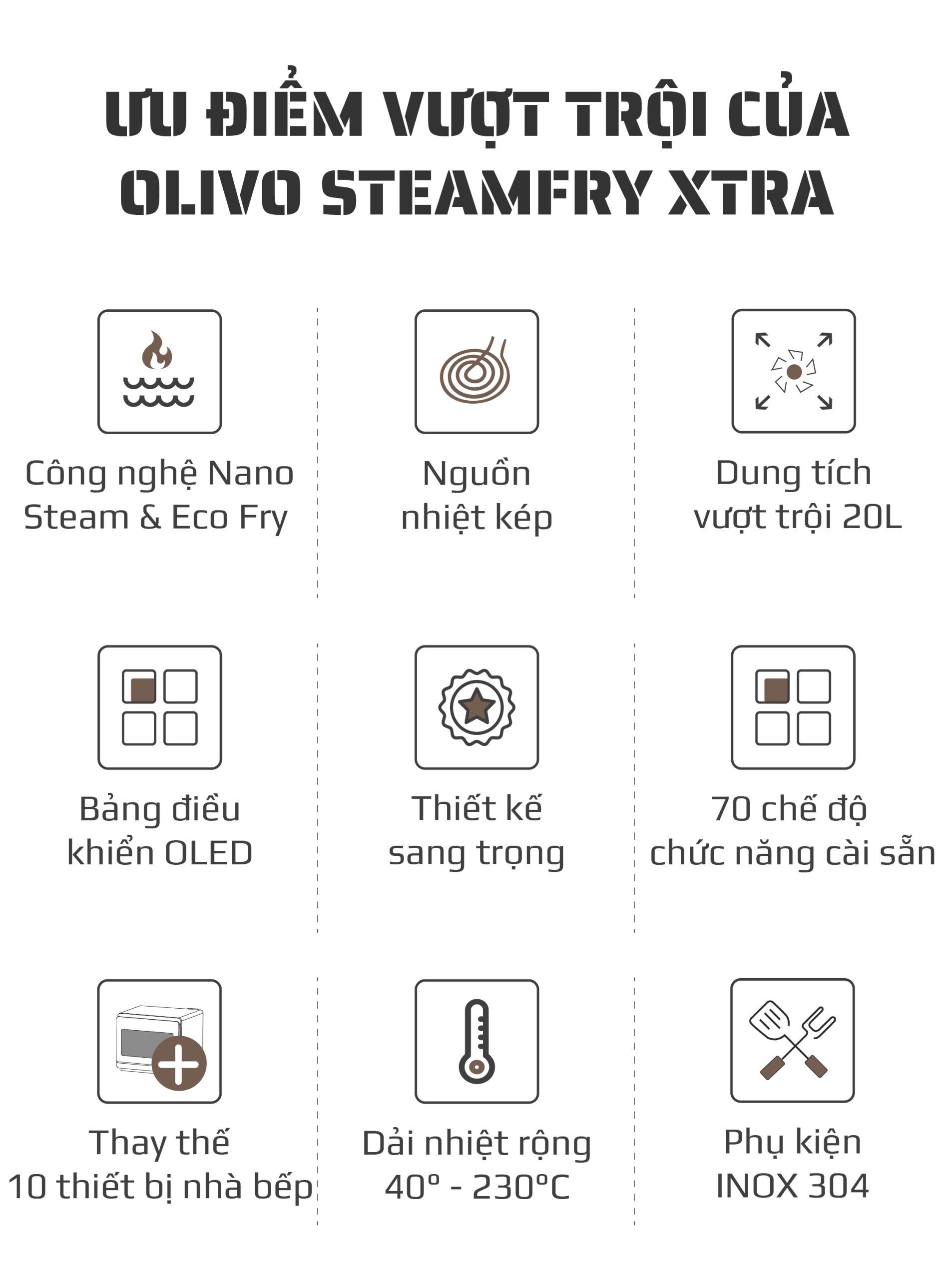 - Nồi chiên hấp đa năng OLIVO SteamFry Xtra mở ra chuẩn mực mới cho căn bếp hiện đại với khả năng kết hợp chiên không dầu và hấp siêu nhiệt trong cùng một thiết bị thông minh. Thuộc phân khúc nồi chiên cỡ lớn, OLIVO SteamFry Xtra sở hữu dung tích 20L, 70 chế độ nấu cài sẵn và hiệu năng mạnh mẽ tương tự dòng OLIVO SF20 Pro nhưng được nâng tầm vượt trội nhờ bảng điều khiển OLED sống động và diện mạo màu Titanium phối vân gỗ đầy tinh tế. Một thiết kế vừa sang trọng, vừa đẳng cấp, đồng thời mang đến trải nghiệm nấu nướng đa nhiệm, chuẩn vị và tiện lợi cho mọi gia đình.