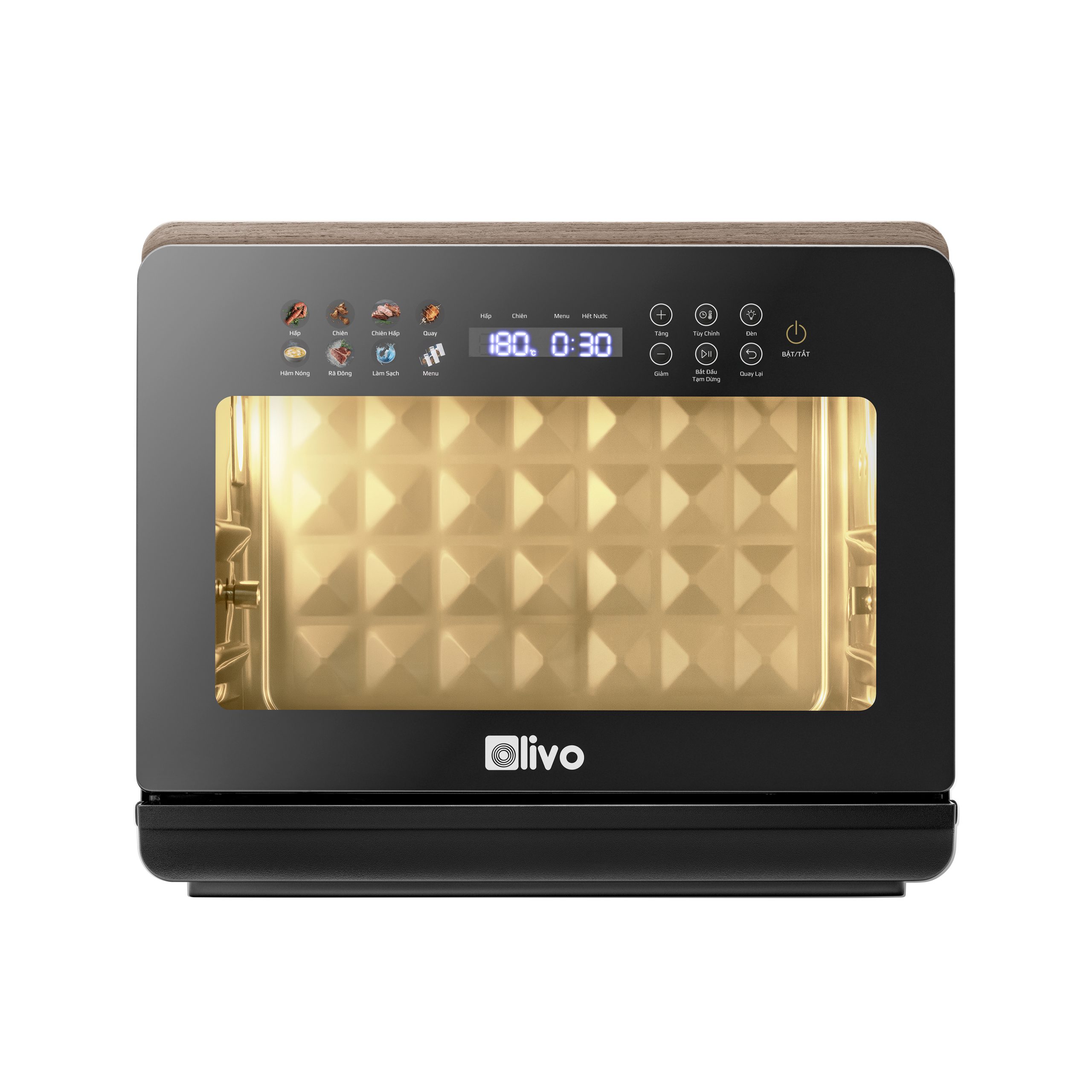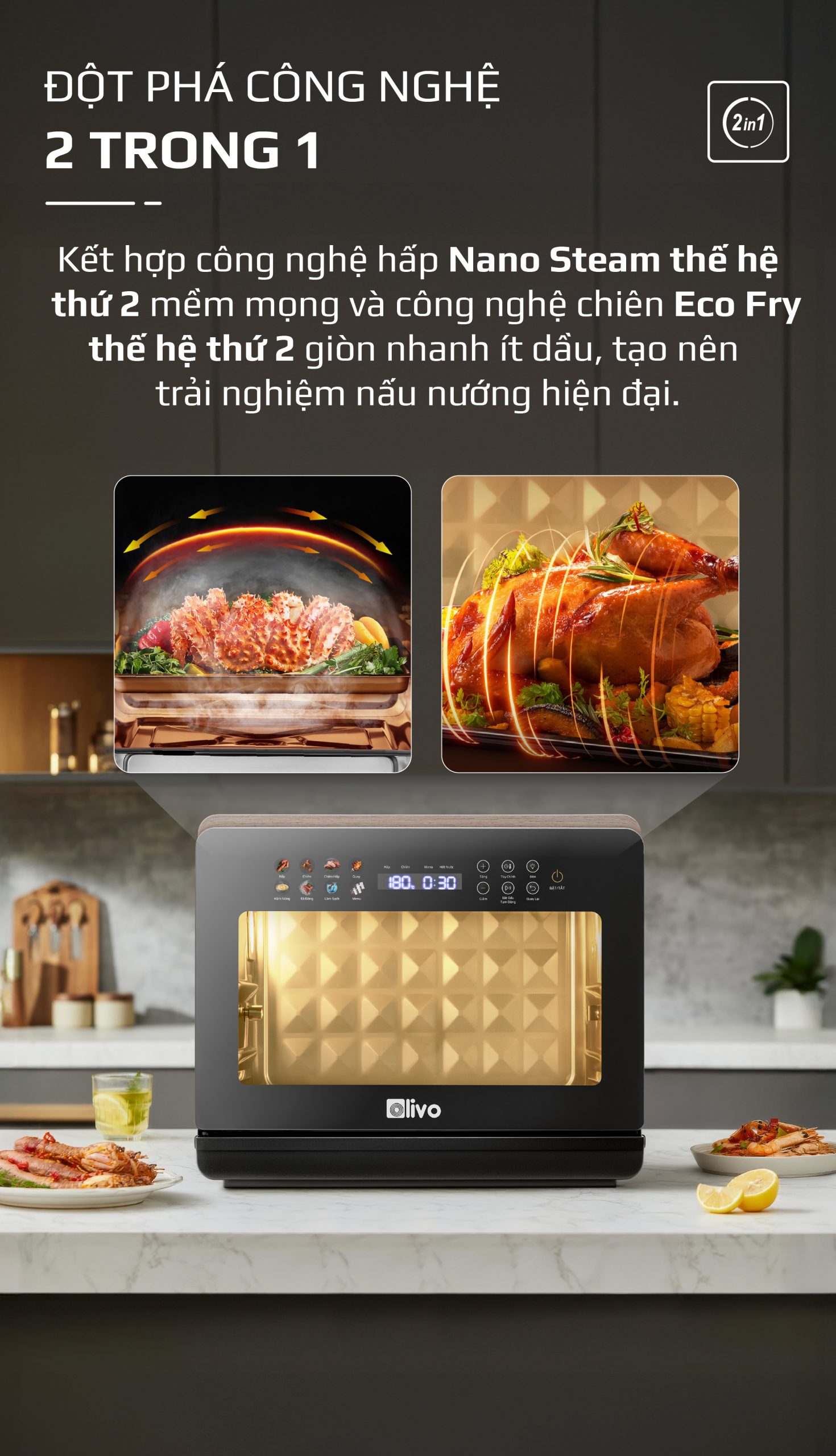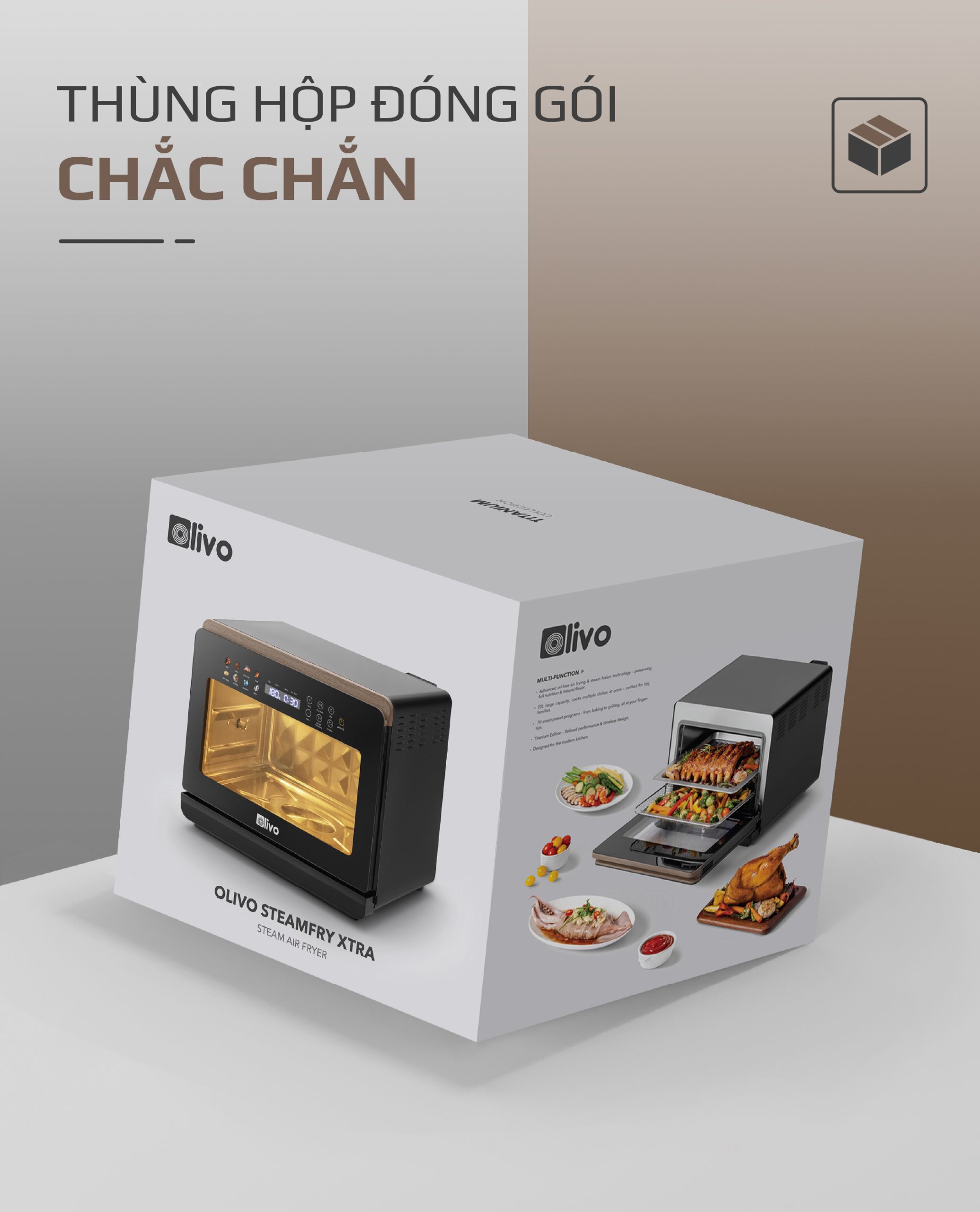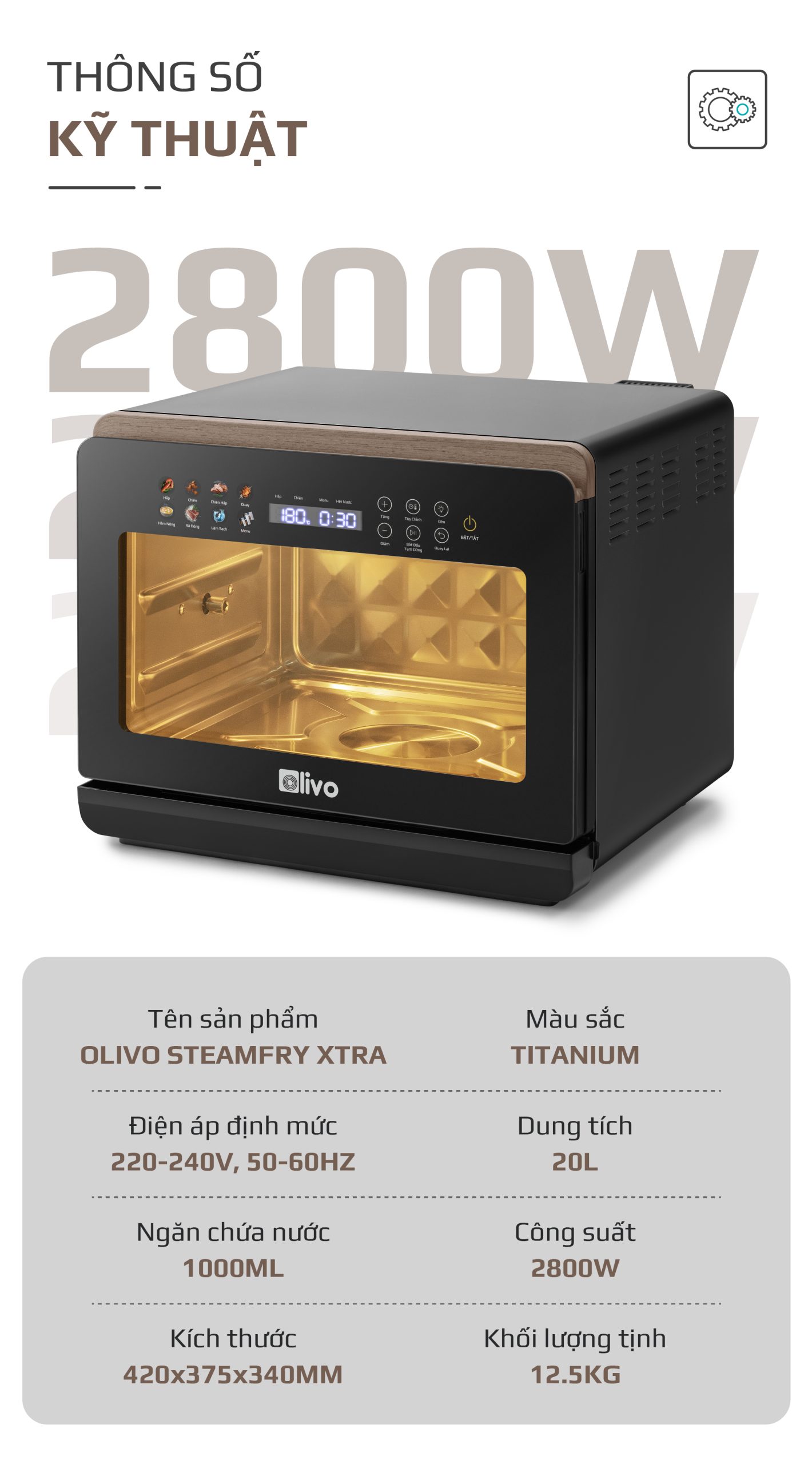 - Nồi chiên hấp đa năng OLIVO SteamFry Xtra mở ra chuẩn mực mới cho căn bếp hiện đại với khả năng kết hợp chiên không dầu và hấp siêu nhiệt trong cùng một thiết bị thông minh. Thuộc phân khúc nồi chiên cỡ lớn, OLIVO SteamFry Xtra sở hữu dung tích 20L, 70 chế độ nấu cài sẵn và hiệu năng mạnh mẽ tương tự dòng OLIVO SF20 Pro nhưng được nâng tầm vượt trội nhờ bảng điều khiển OLED sống động và diện mạo màu Titanium phối vân gỗ đầy tinh tế. Một thiết kế vừa sang trọng, vừa đẳng cấp, đồng thời mang đến trải nghiệm nấu nướng đa nhiệm, chuẩn vị và tiện lợi cho mọi gia đình.