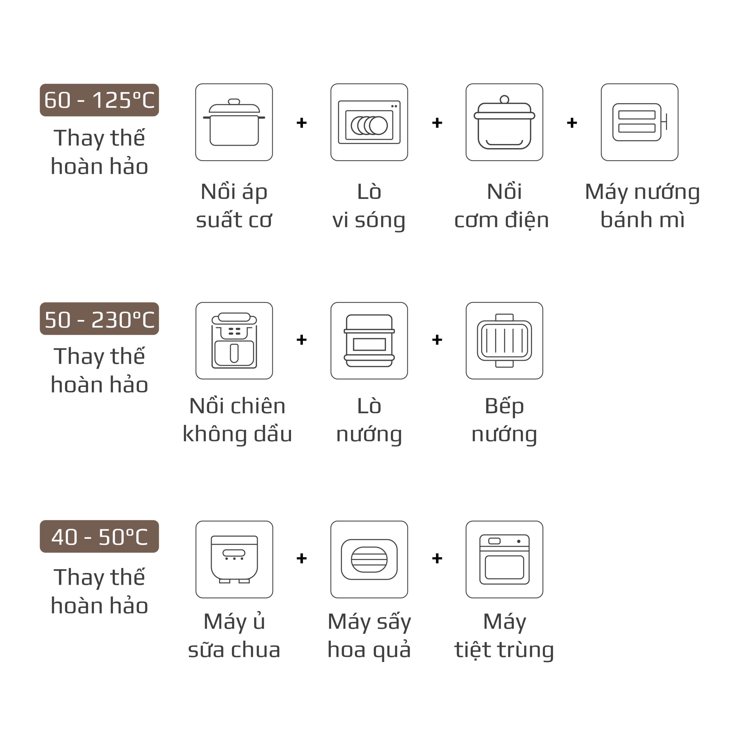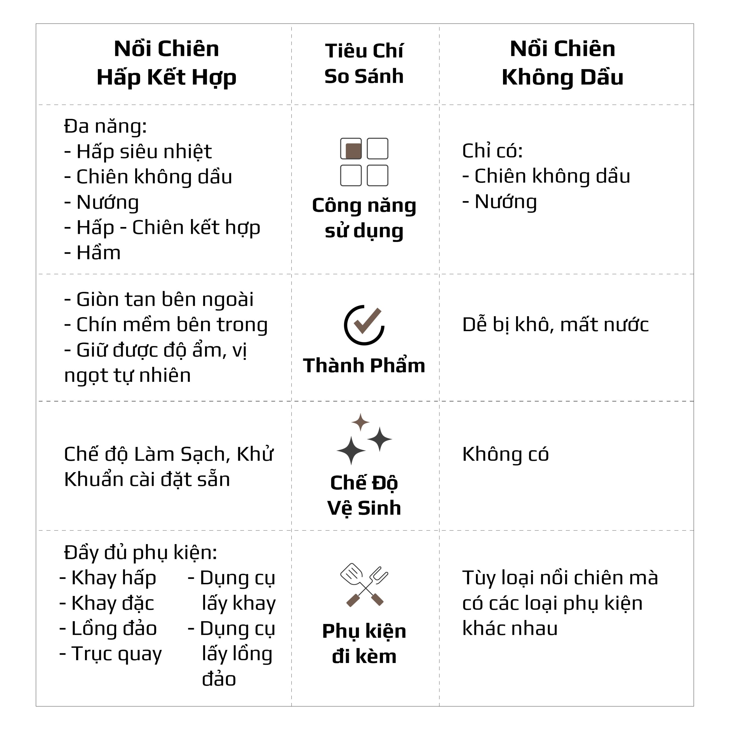 - Chiên không dầu chiên đồ ăn vàng giòn mà không cần dùng đến dầu mỡ, giảm đến 95% lượng dầu mỡ dư thừa trong bữa ăn hàng ngày. Trong khi đó, hấp đồ ăn bằng hơi nước siêu nhiệt giúp giảm thời gian hấp, đồng thời bảo toàn tối đa dinh dưỡng có trong thực phẩm.
