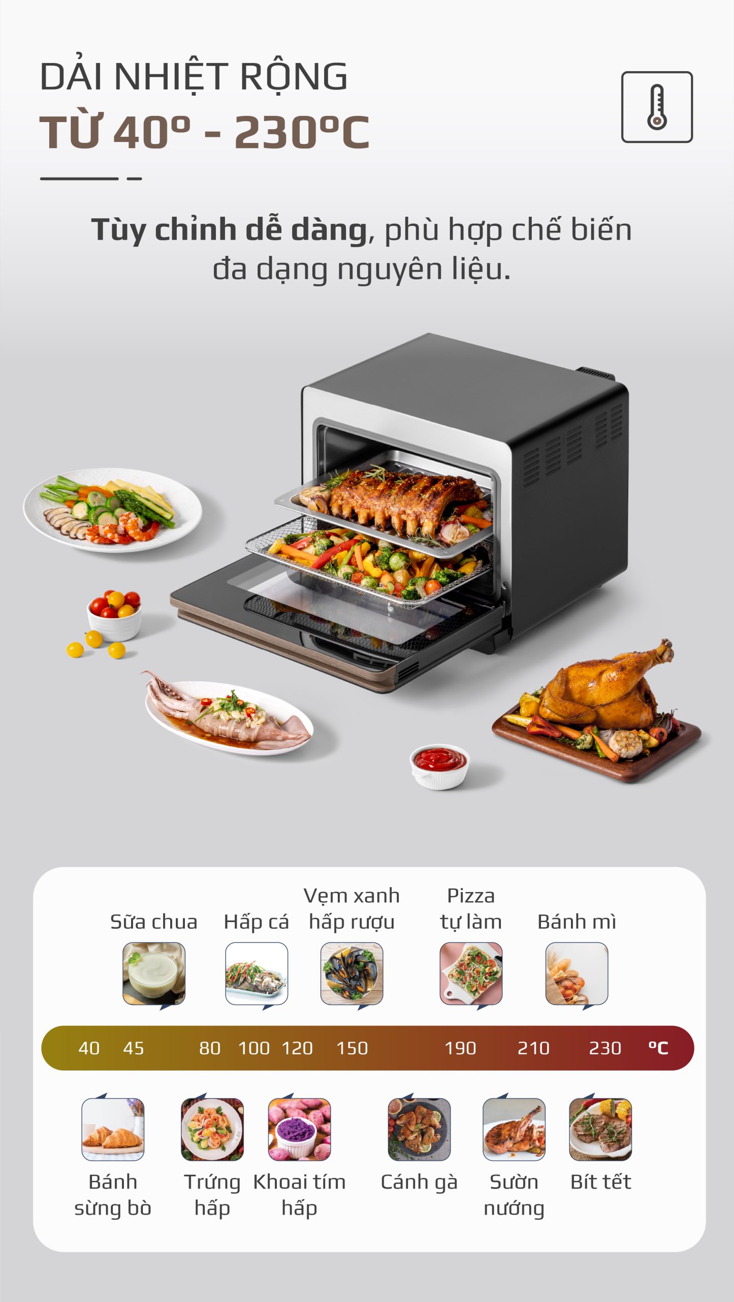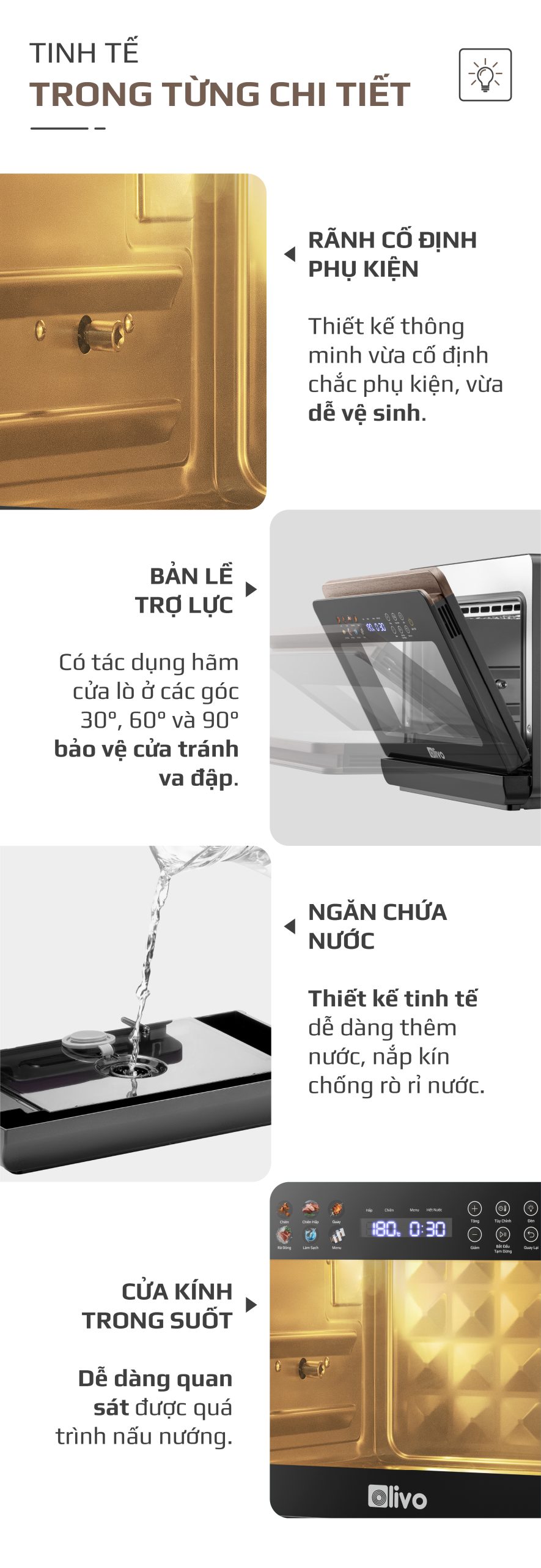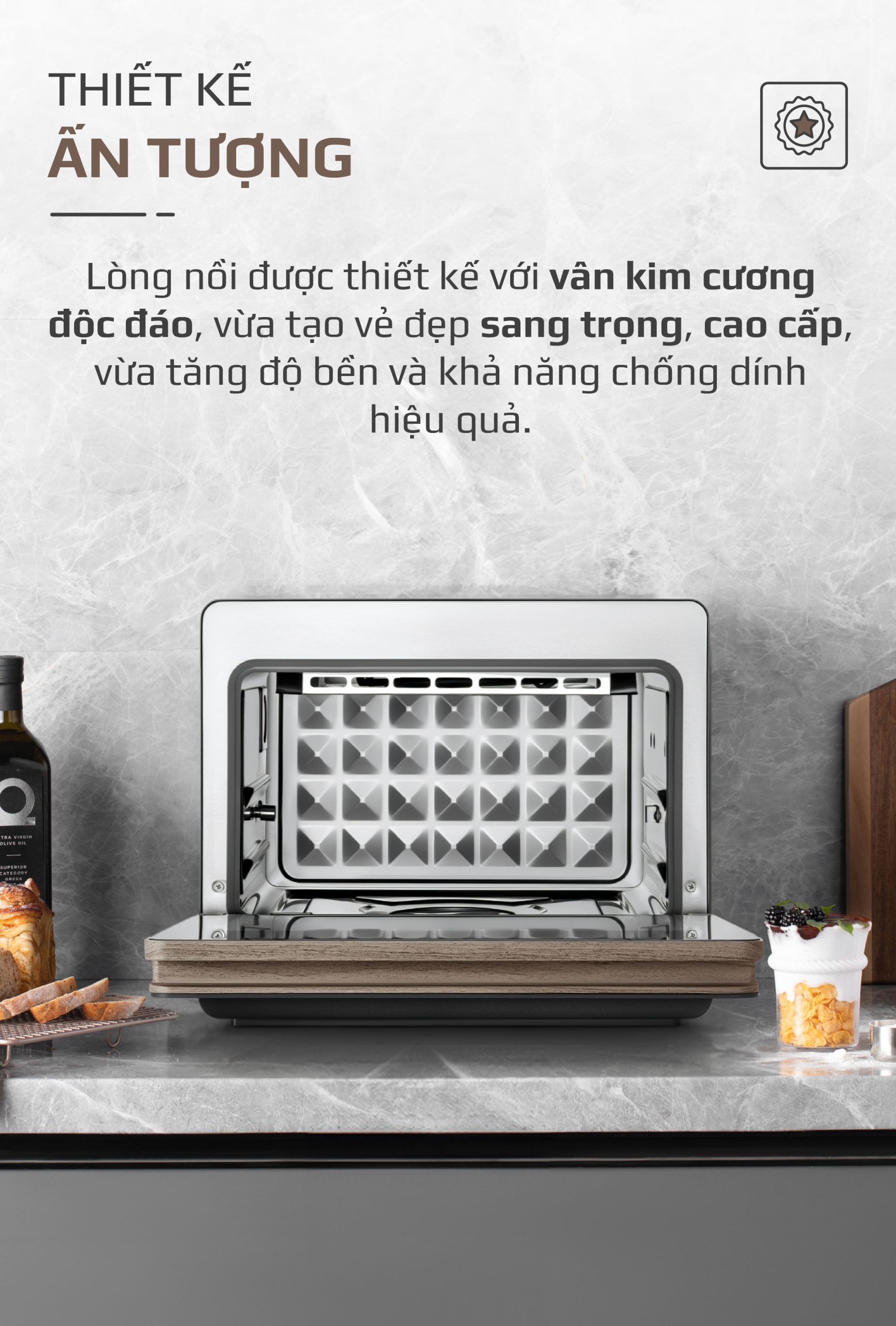 - Sự tinh tế này được hoàn thiện bằng gam màu Titanium thời thượng kết hợp viền vân gỗ mềm mại, tạo nên vẻ ngoài hài hòa, đẳng cấp nhưng vẫn giữ được sự ấm áp, gần gũi trong không gian bếp. Từ cấu trúc bên trong đến nét chạm bên ngoài, mọi chi tiết đều hòa quyện chặt chẽ, mang lại trải nghiệm nấu nướng đầy cảm hứng và tinh tế cho người dùng.