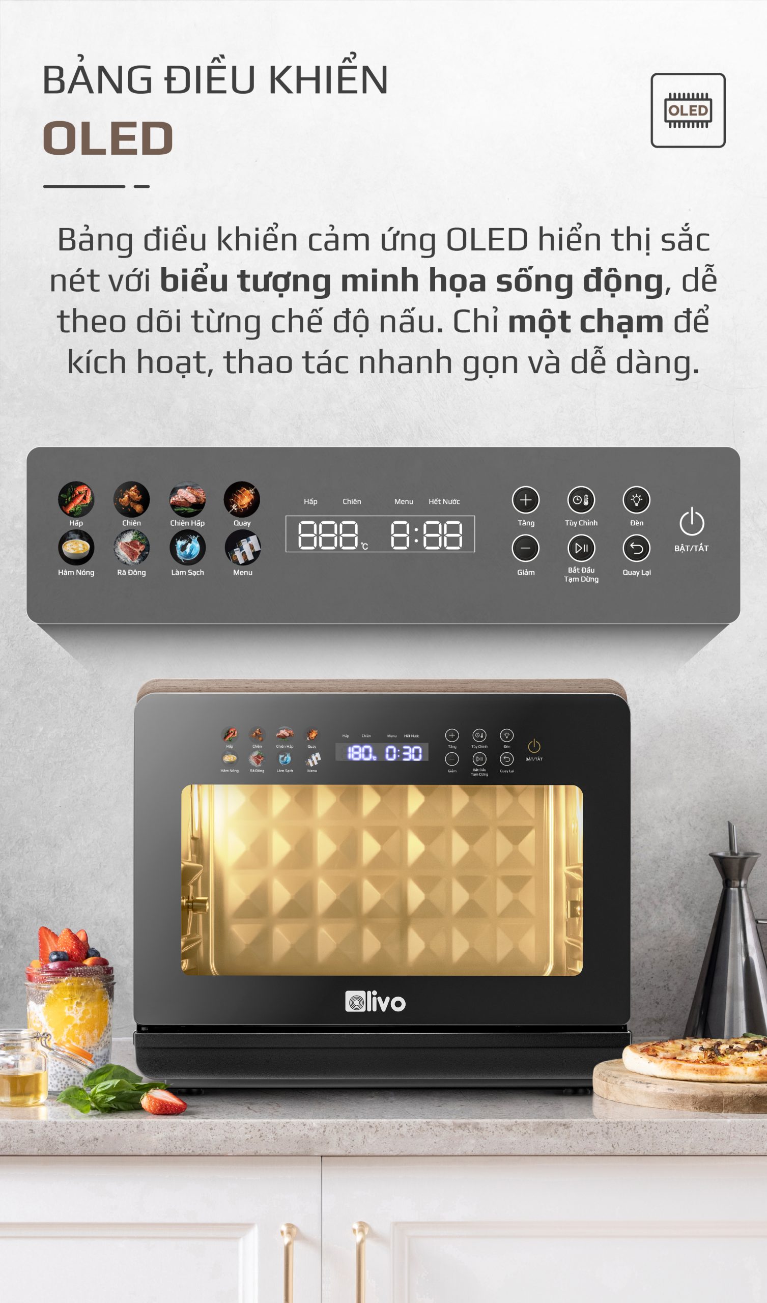 - Bảng điều khiển cảm ứng OLED đem đến trải nghiệm sử dụng mượt mà và hiện đại hơn bao giờ hết. Màn hình hiển thị rõ ràng với các biểu tượng trực quan và chú thích bằng tiếng Việt, giúp người dùng “nhìn phát hiểu ngay” từng chương trình/chế độ. Chỉ cần chạm nhẹ, mọi thao tác đều được phản hồi tức thì nhanh gọn, chính xác và cực kỳ thân thiện. Nhờ giao diện sinh động và dễ theo dõi, quá trình nấu nướng trở nên thoải mái hơn, mang lại cảm giác như đang điều khiển một thiết bị bếp thông minh đẳng cấp thực thụ.