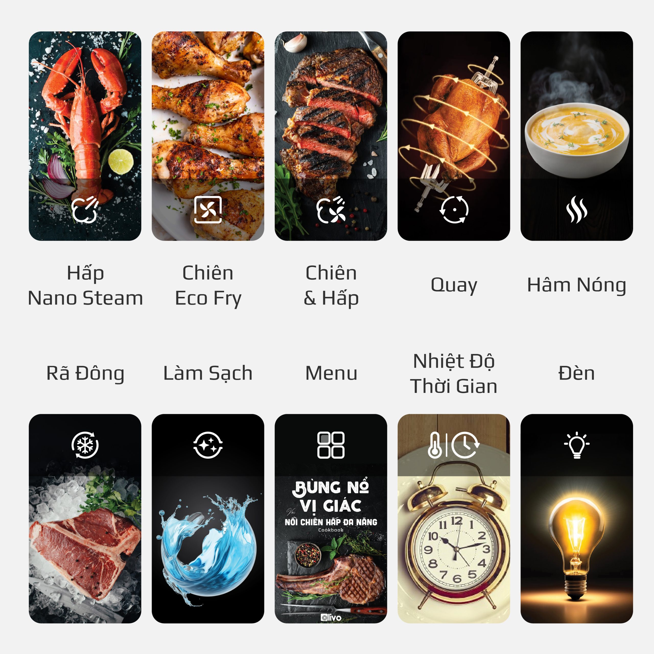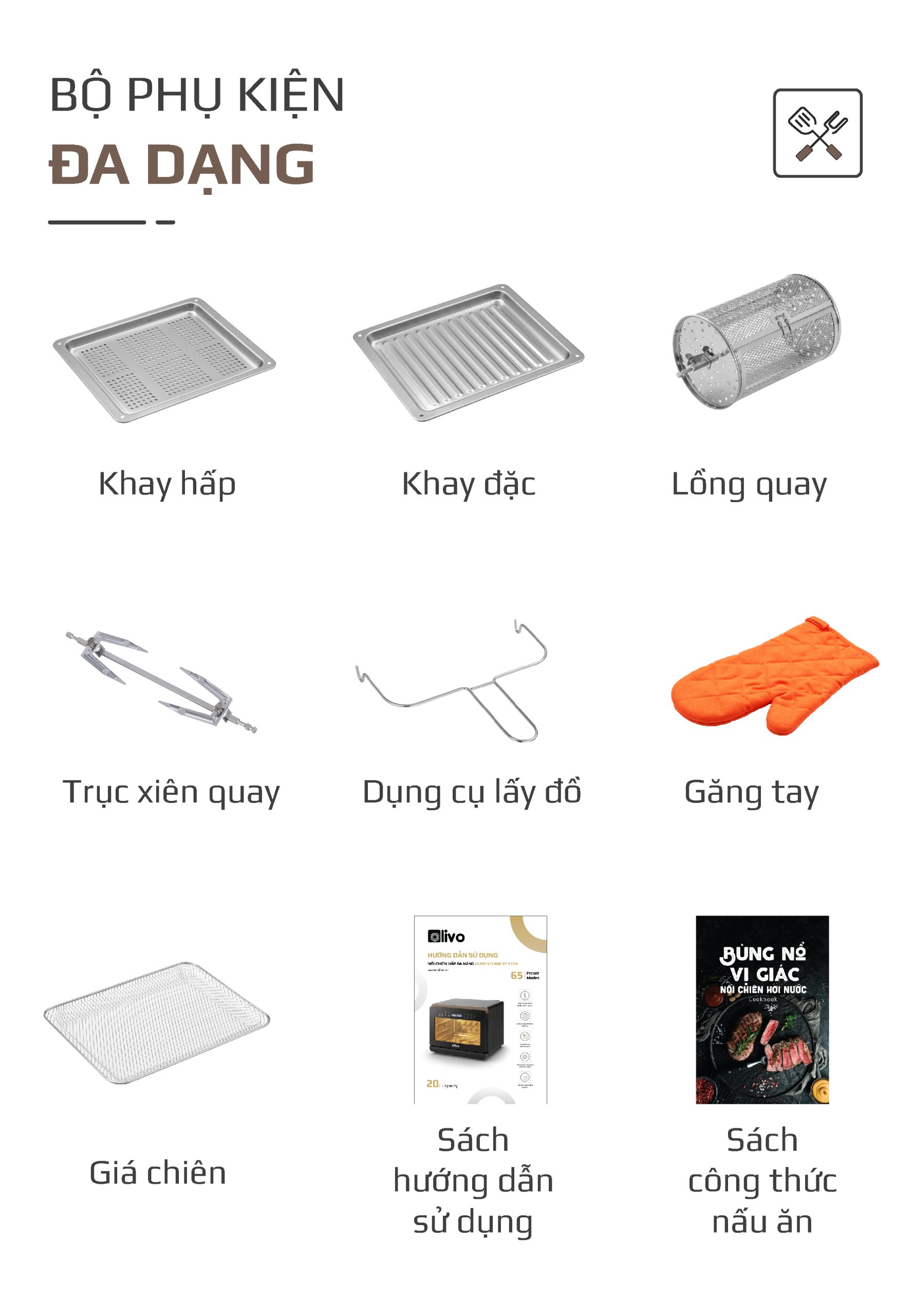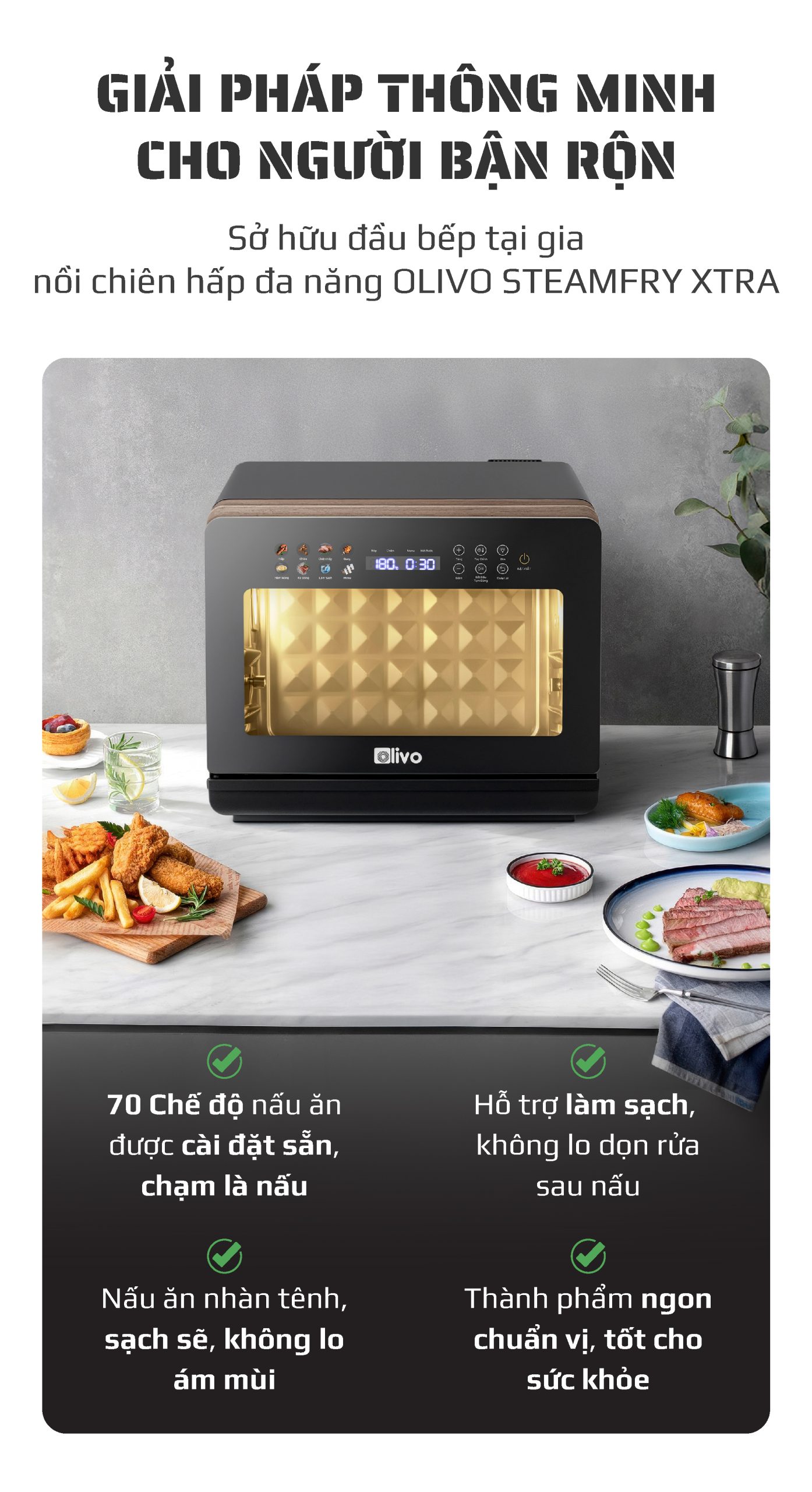 OLIVO SteamFry Xtra với 70 chức năng cài đặt sẵn là một bước tiến đáng kể, mang đến cho người dùng những trải nghiệm nấu nướng đa dạng và tiện lợi hơn.