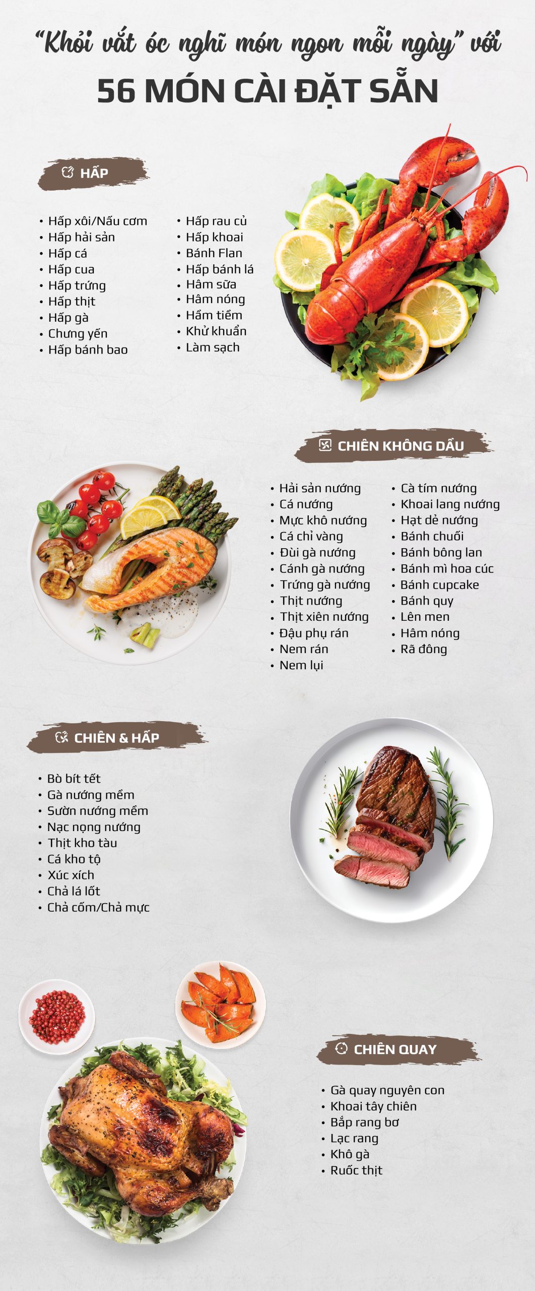 - Đa dạng món ăn: Bạn có thể dễ dàng chế biến nhiều món ăn khác nhau, từ các món chiên, nướng truyền thống đến các món hấp, nướng, hầm, thậm chí là làm bánh. Điều này đáp ứng nhu cầu ẩm thực đa dạng của mọi gia đình.