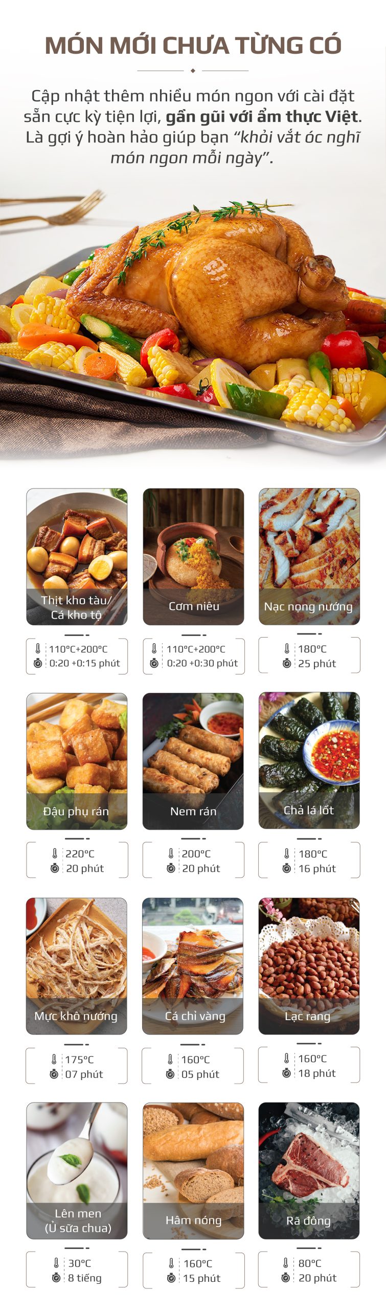 OLIVO SteamFry Xtra cũng được cập nhật thêm nhiều món ngon cài đặt sẵn tiện lợi chưa từng có, gần gũi với ẩm thực Việt và tiện lợi nấu ăn hàng ngày như: