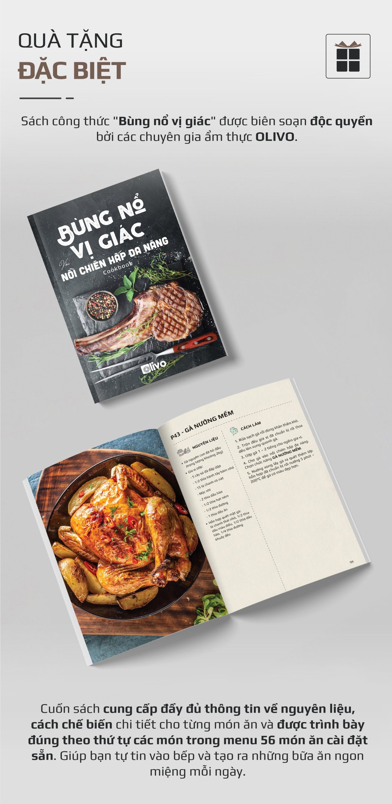 - Sách công thức nấu “Bùng nổ vị giác” do đội ngũ chuyên gia ẩm thực của OLIVO biên soạn.