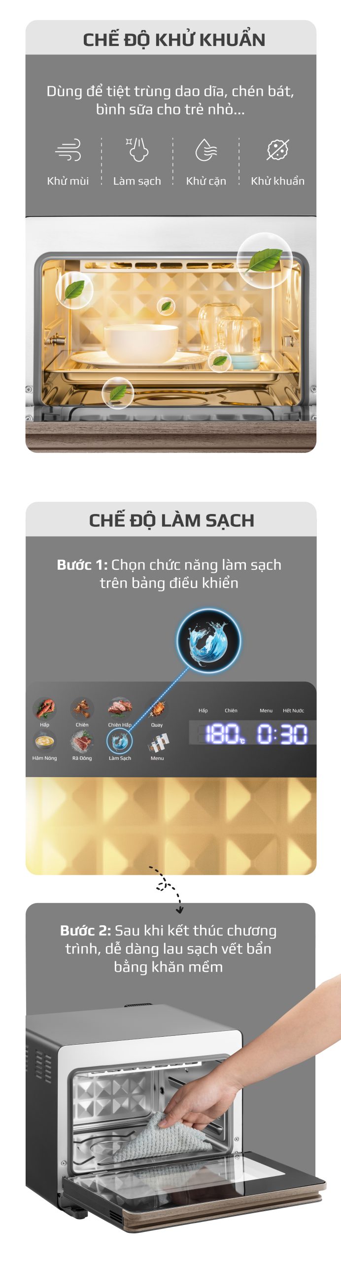 - Ngoài ra, sau khi chọn chức năng Làm Sạch có thể chọn thêm chức năng Khử Khuẩn để làm sạch sâu, loại bỏ vi khuẩn đảm bảo khoang nồi luôn sạch bong, sáng bóng.