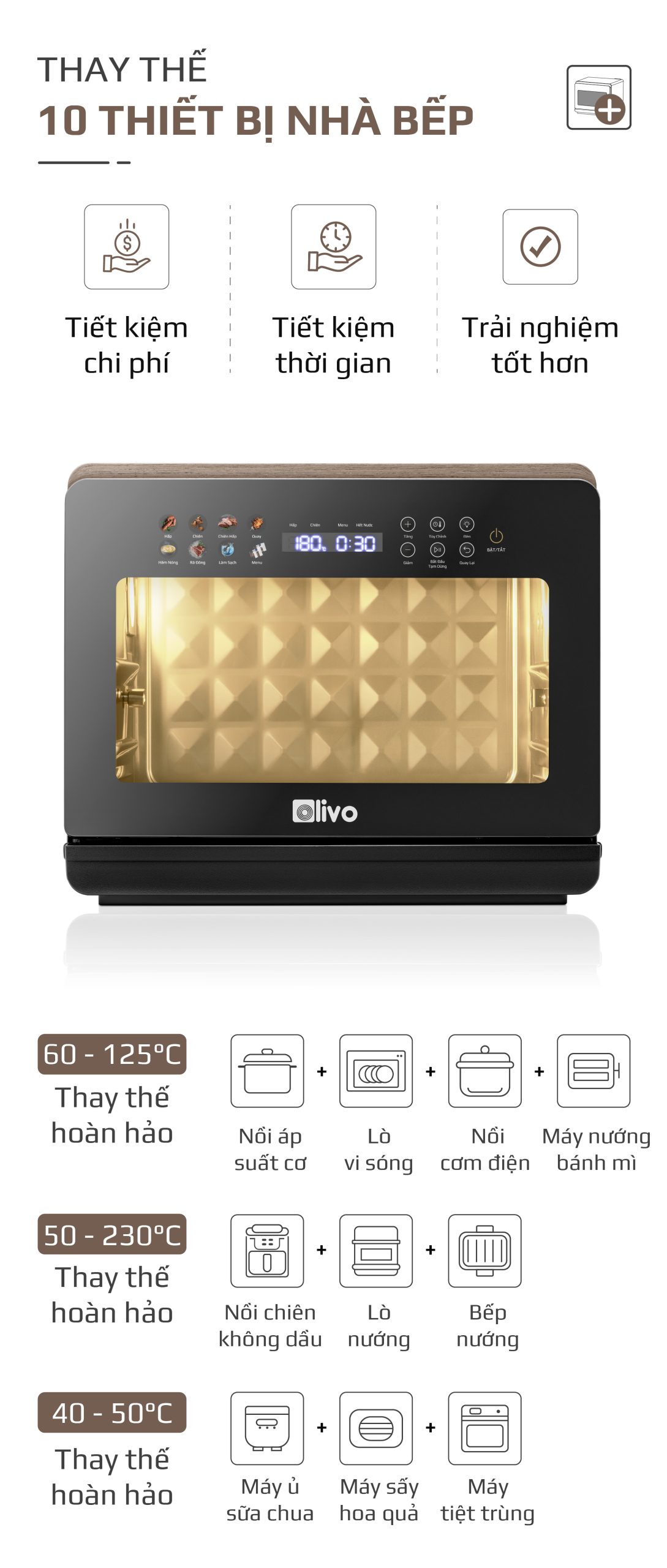 - Nồi chiên hơi nước OLIVO SteamFry Xtra có dải nhiệt từ 40-230 độ C, đây được coi là dải nhiệt rộng ấn tượng ở một chiếc nồi chiên. Với dải nhiệt rộng vượt trội, bạn có thể dùng nồi để chế biến nhiều món hơn như ủ sữa chua, sấy hoa quả đến quay gà, tôm, cá…
