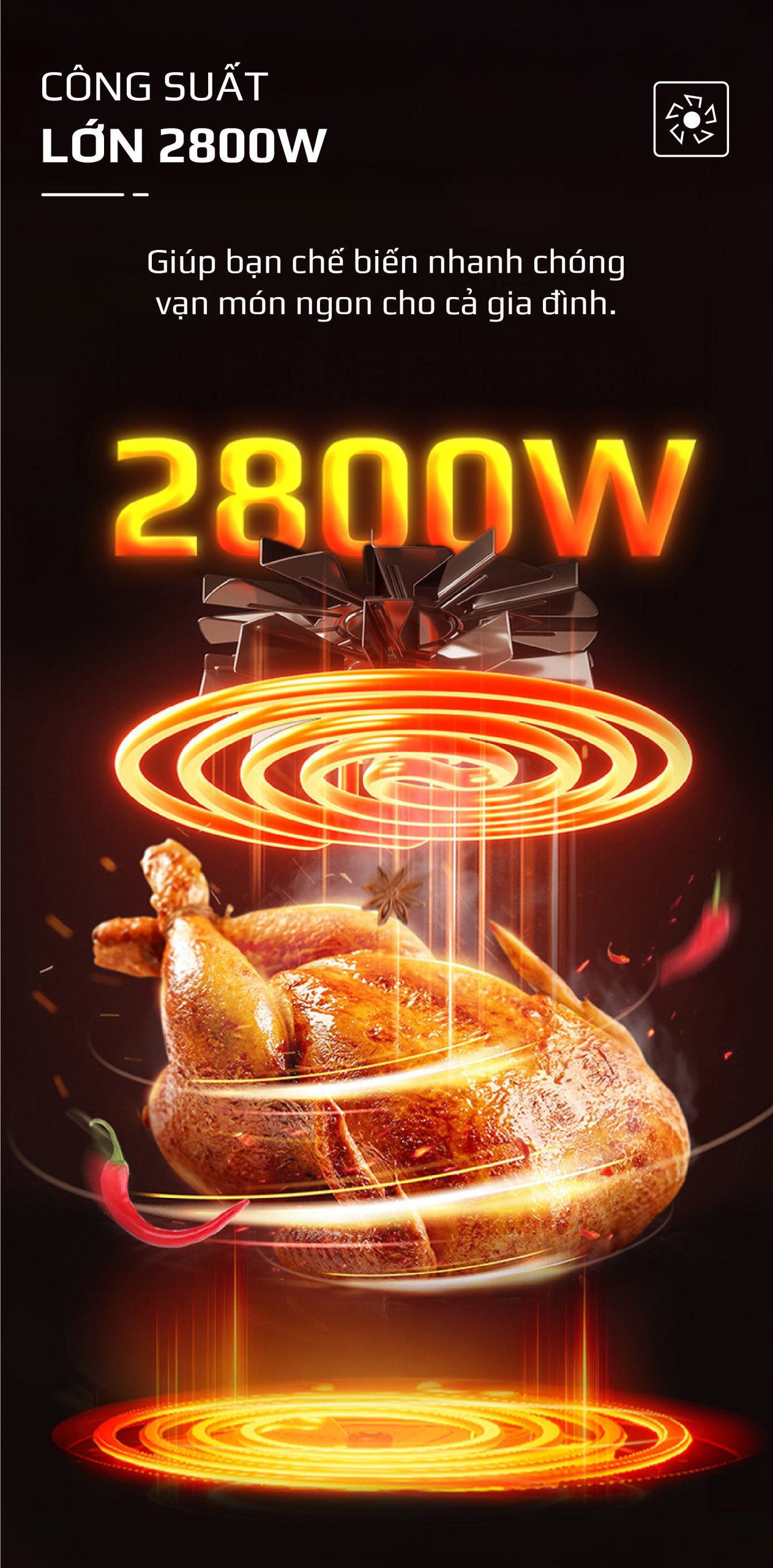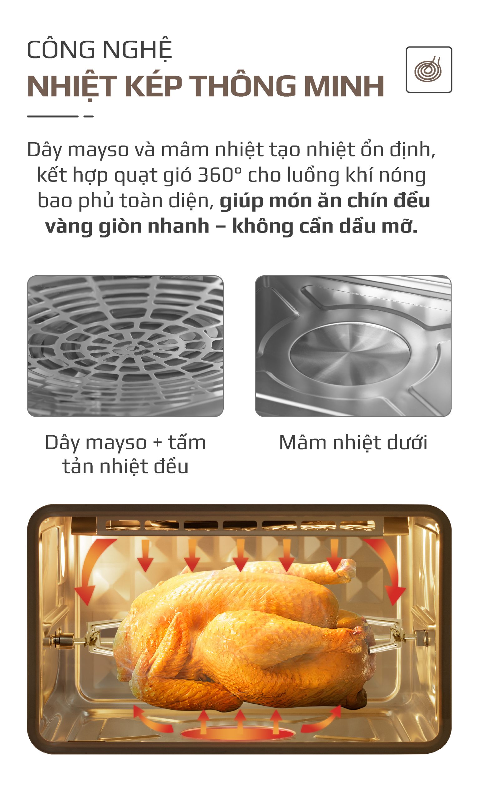 - Tạo luồng không khí nóng: Công nghệ này sử dụng quạt để tạo ra luồng không khí nóng mạnh mẽ, tuần hoàn đều khắp khoang nồi.