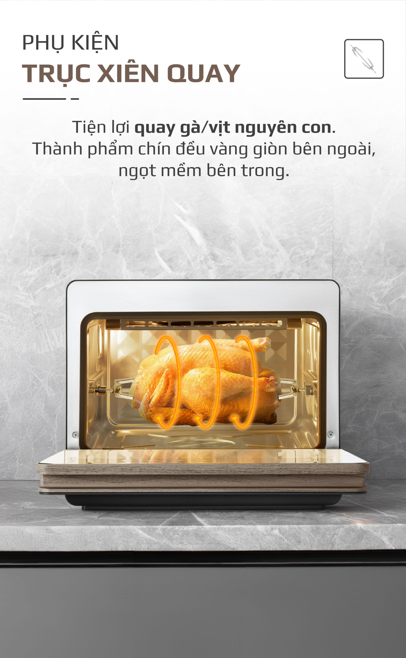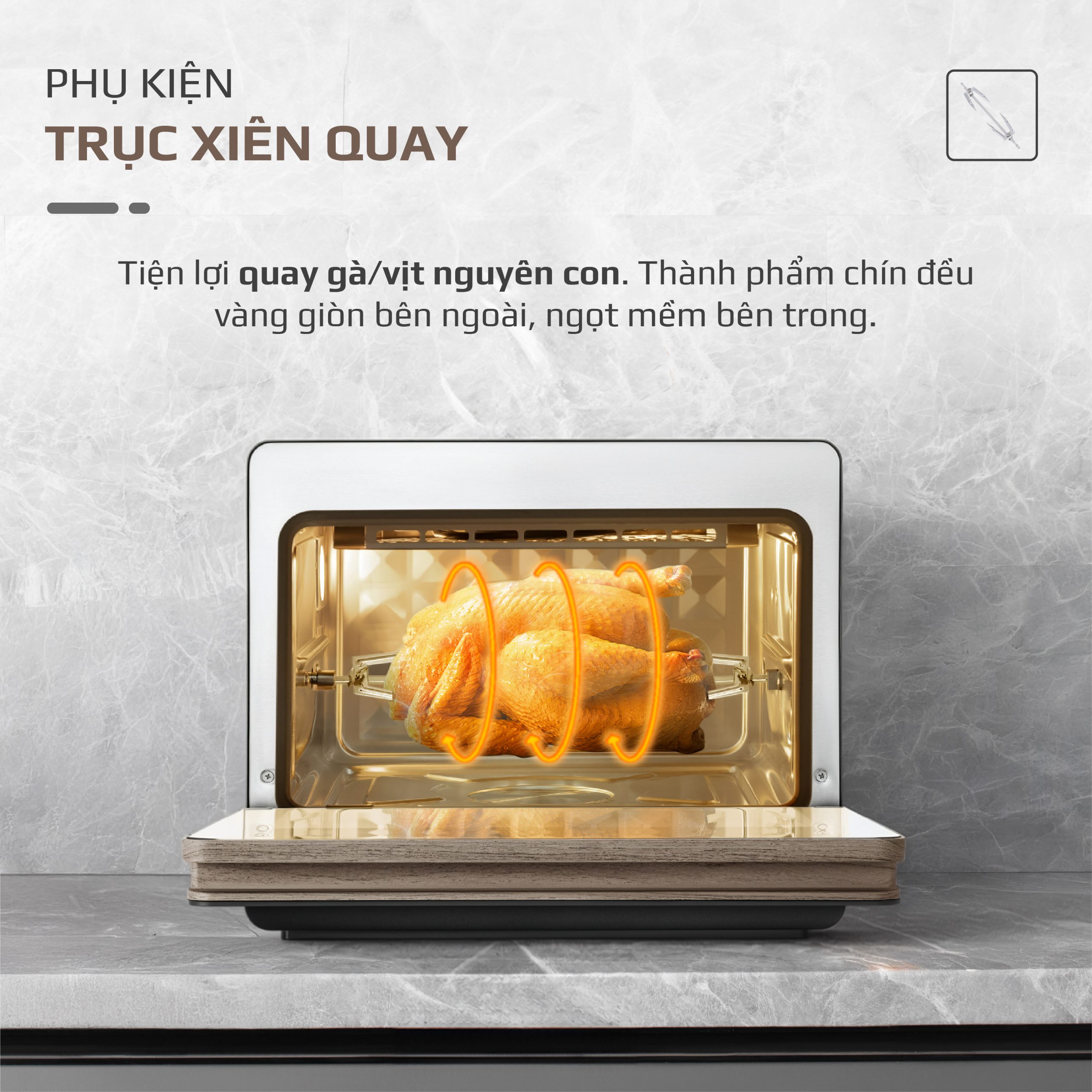 - Quay gà nguyên con: Dễ dàng quay cả con gà lớn, đáp ứng nhu cầu của những bữa tiệc gia đình.