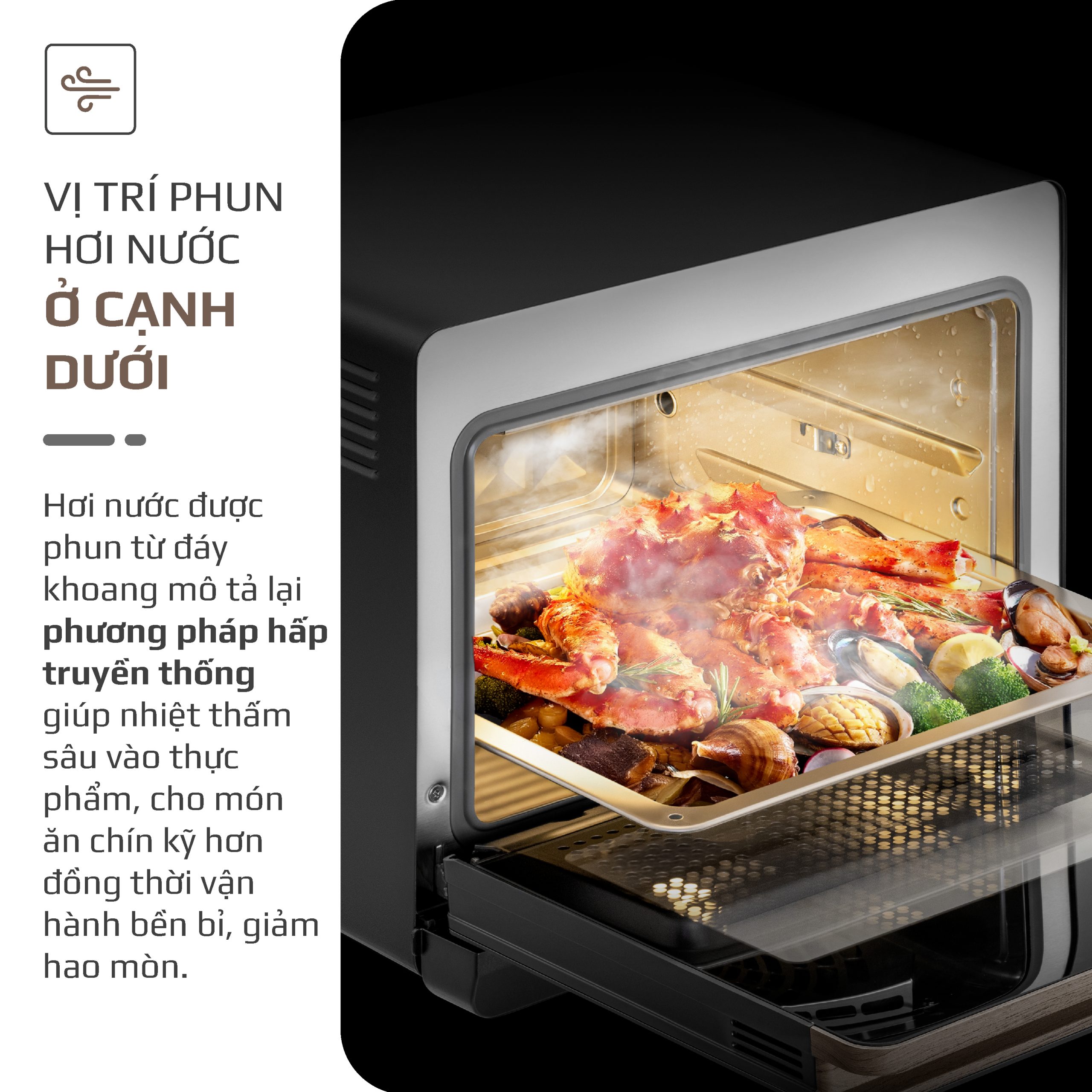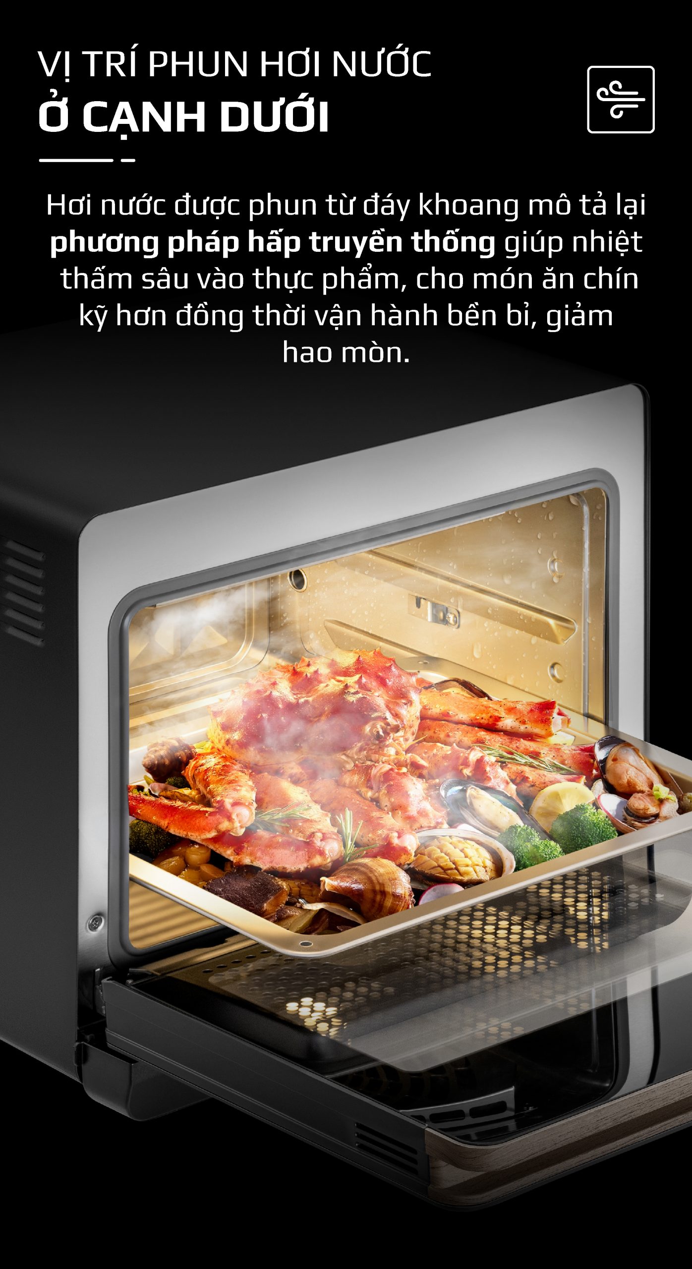 - Giữ trọn hương vị và dinh dưỡng: Hơi nước nano thẩm thấu nhanh và đều, giúp thực phẩm chín đều bên trong mà không bị khô, giữ lại được tối đa vitamin, khoáng chất và các dưỡng chất khác.