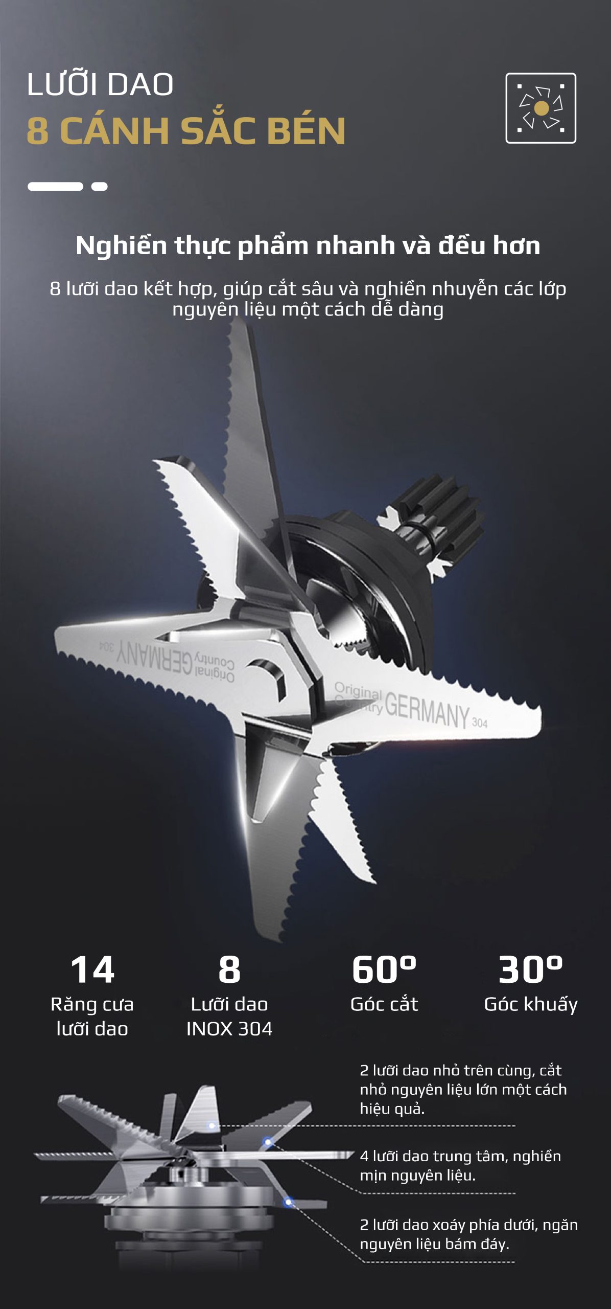 - Lưỡi dao làm từ INOX 304 vừa đảm bảo an toàn cho sức khỏe vừa sắc bén giúp nghiền thực phẩm nhanh và đều hơn. Xử lý gọn được mọi loại hạt cứng một cách dễ dàng.