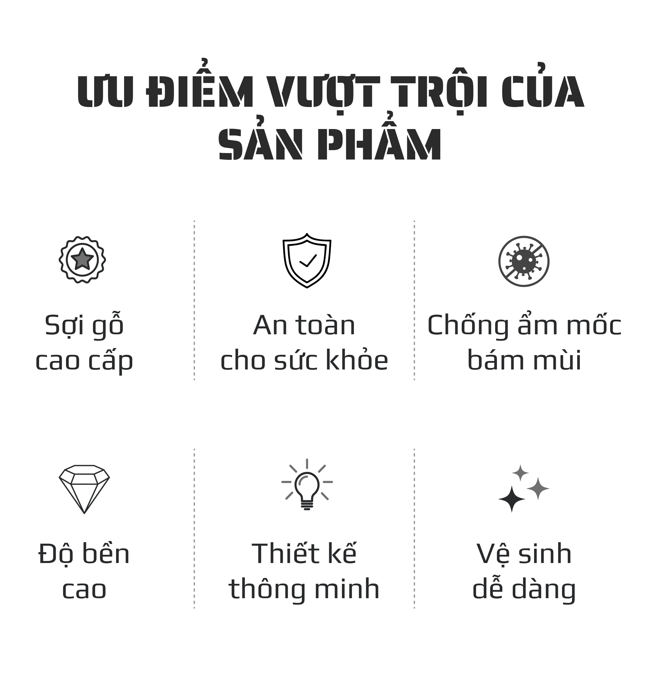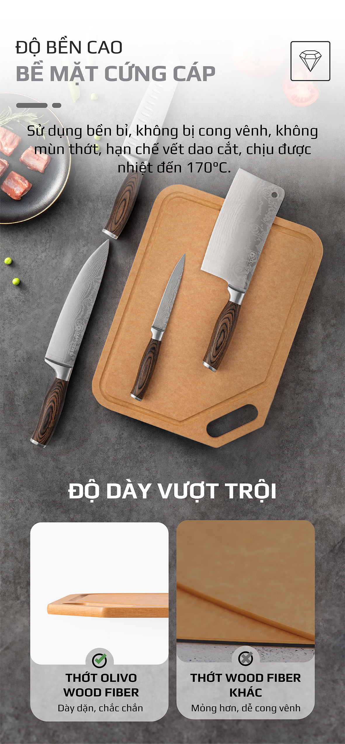 - WOOD FIBER – Sợi gỗ tự nhiên được ép chặt với áp lực 3000 tấn trong môi trường nhiệt độ và áp suất cao, tạo nên chiếc thớt gỗ có độ cứng cáp và bền bỉ vượt trội.